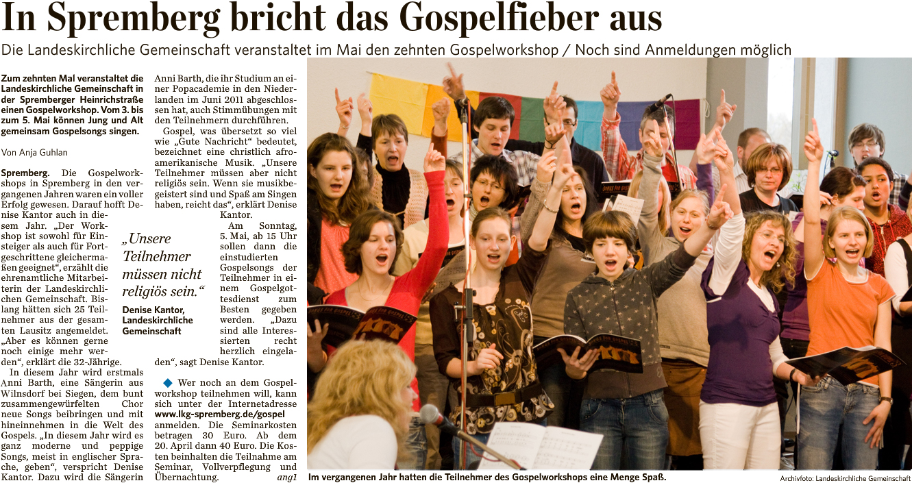 Am 25. April erschien folgender Vorbericht zum 10. Gospelworkshop in der Lausitzer Rundschau im Spremberger Teil. Einfach die Bilder anklicken zum Vergrößern und Lesen.