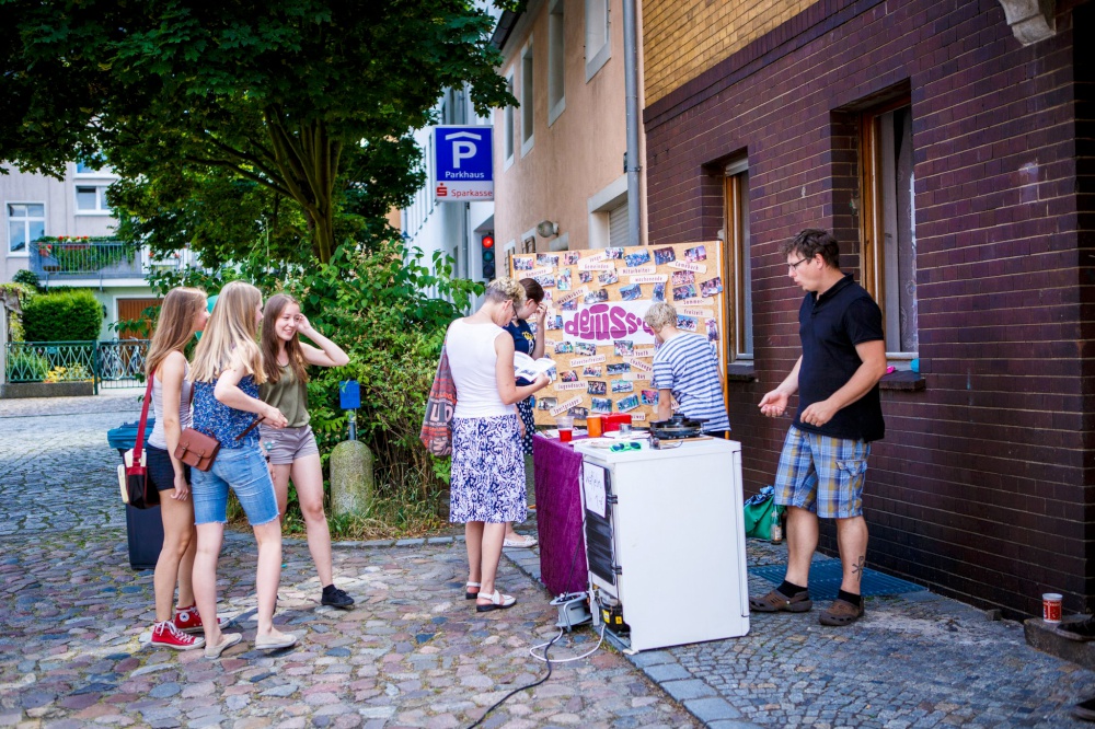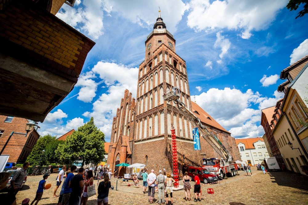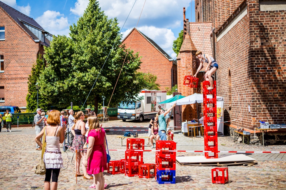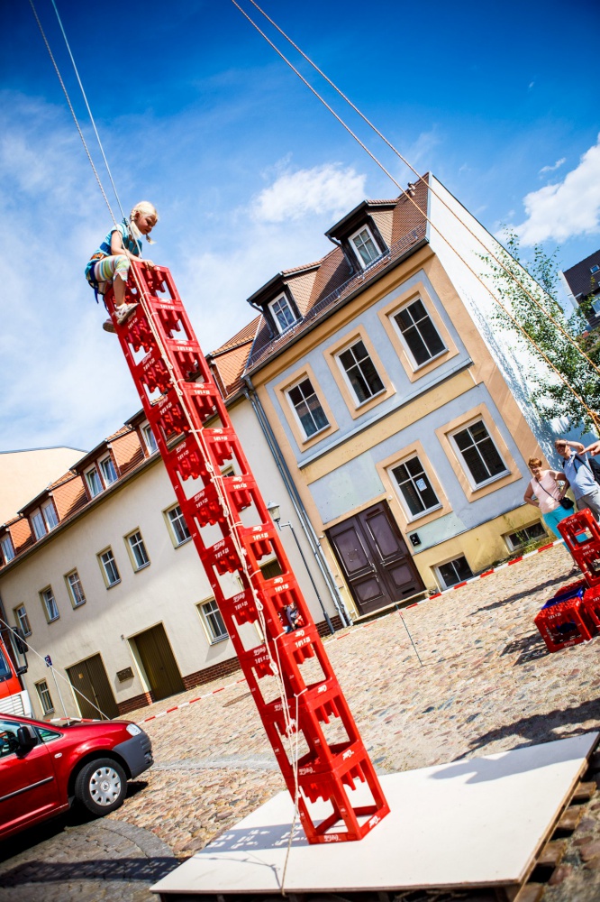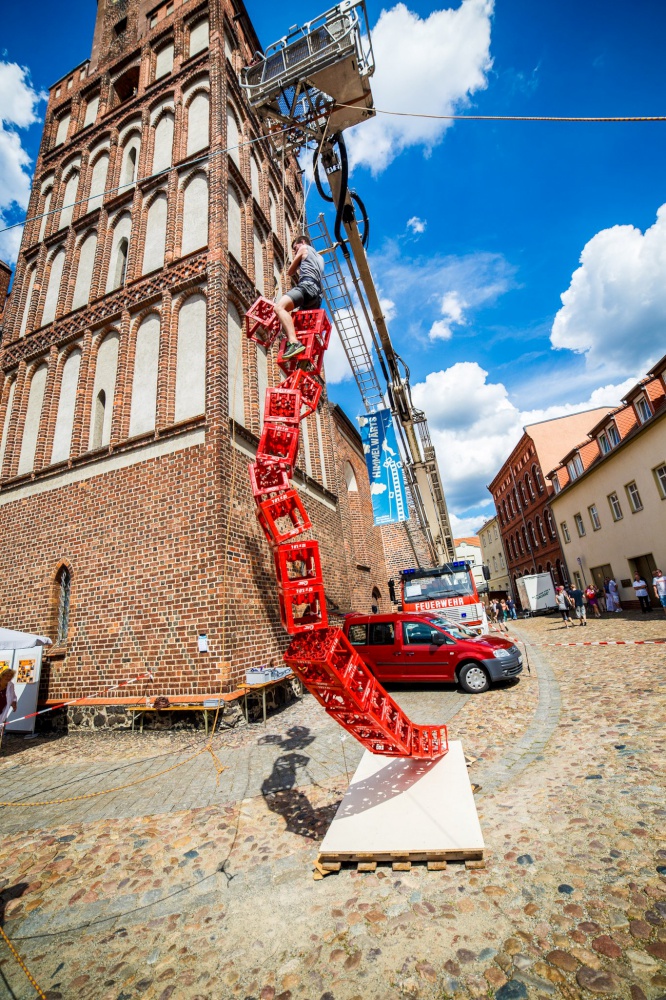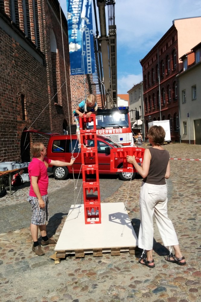 Eine besondere Aktion fand am Wochenende auf der Kirchenmeile (organisiert von den Kirchengemeinden der Stadt) beim Brandenburg-Tag ( 5. + 6. Juli) statt. Direkt an der Kreuzkirche sollten Getränkekisten gestapelt und erklettert werden. Ziel war es, 20 Kisten übereinander zu stapeln, ohne dass der Turm umkippt.