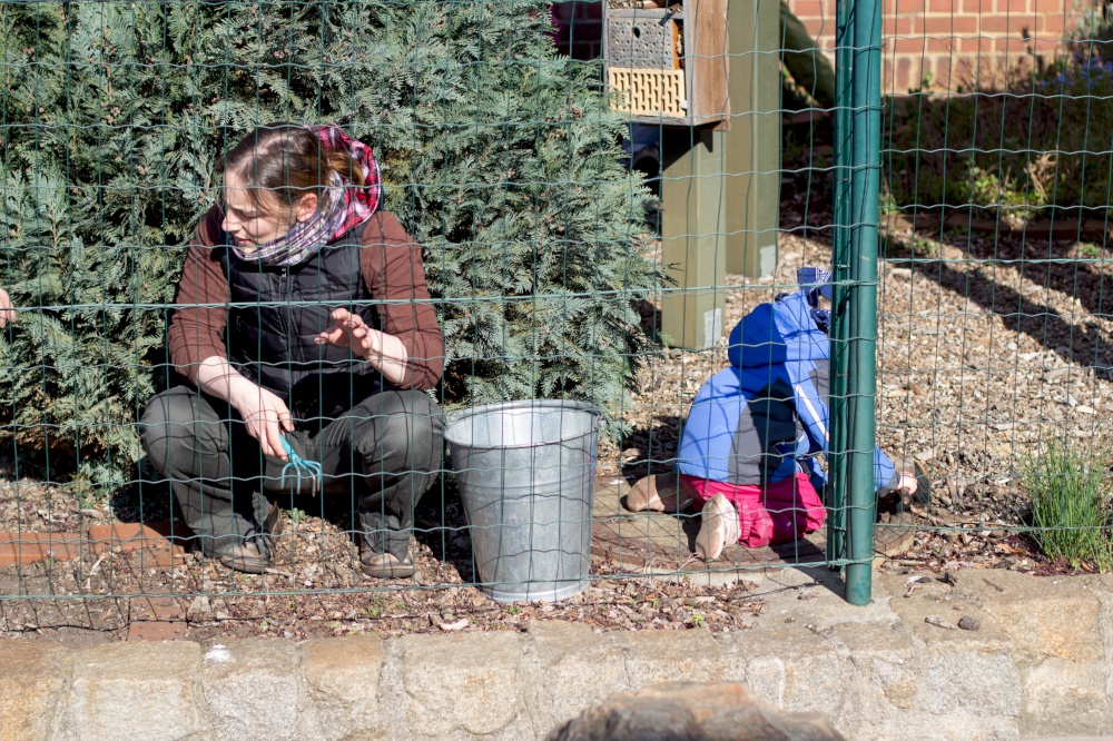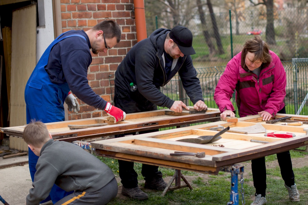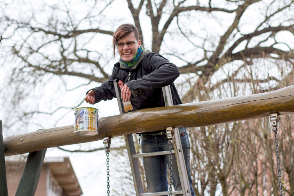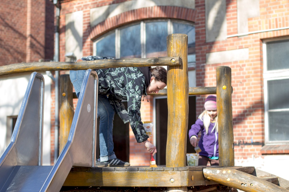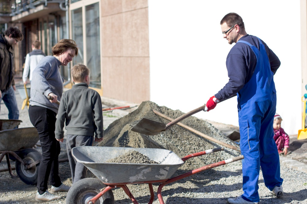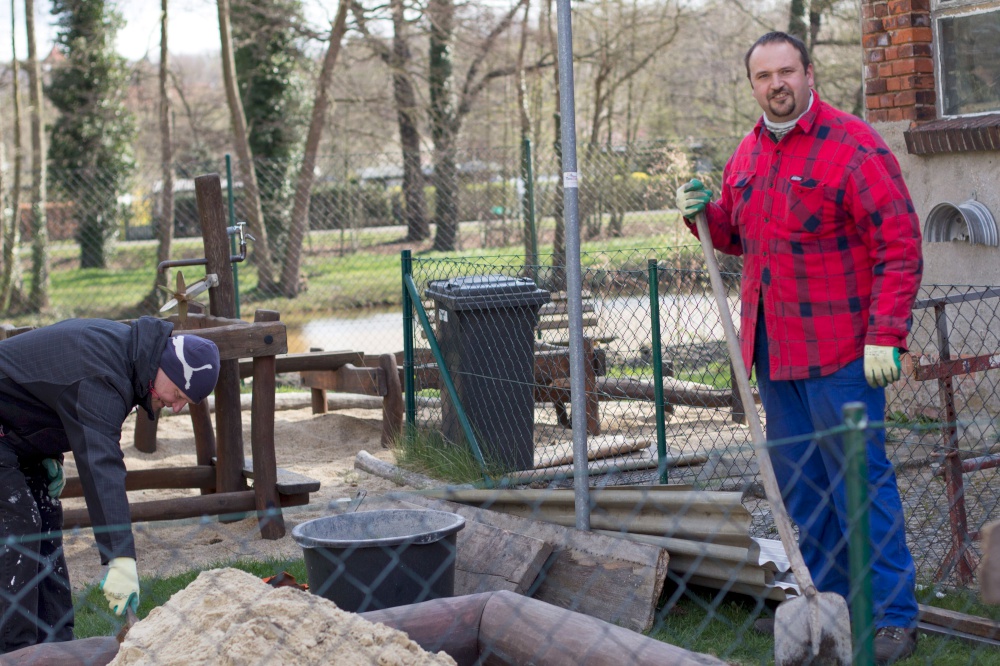 Kita-Eltern und -Kinder, Gemeinschaftsleute von alt bis jung trafen sich zum Putzen und Aufräumen, zum Harken und Unkraut jäten, zum Löcher graben und Löcher füllen, zum Schleifen und Streichen, zum Fenster rausreißen und Fenster einbauen und vielem mehr.