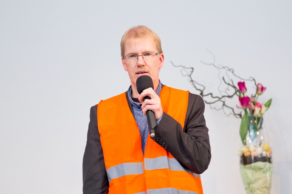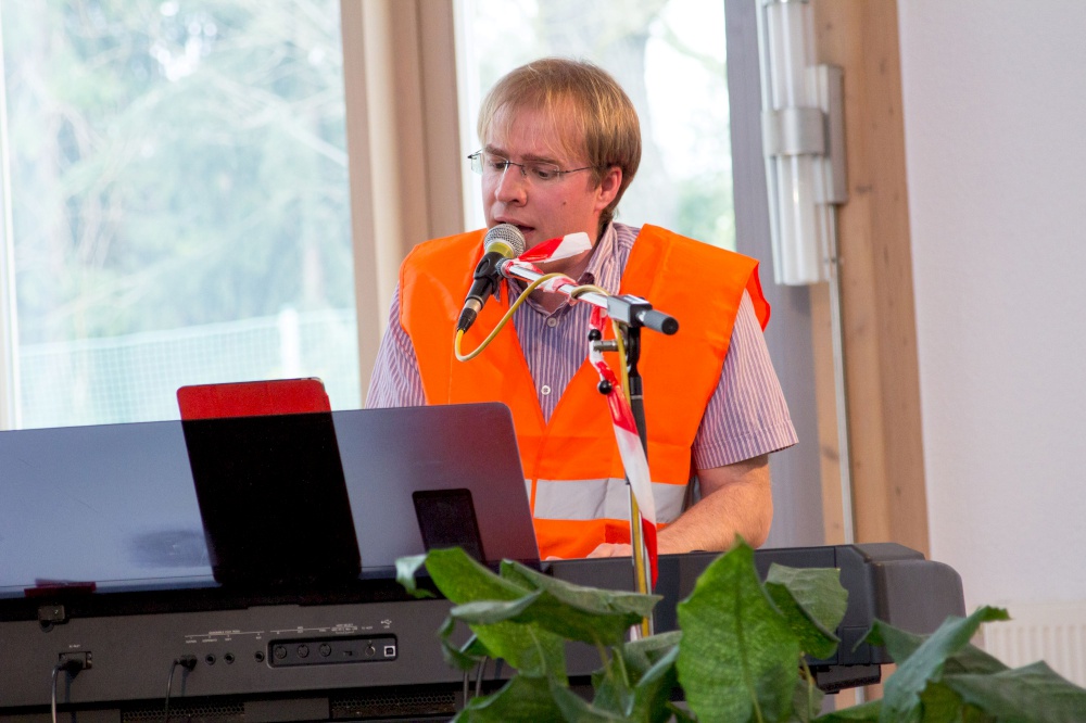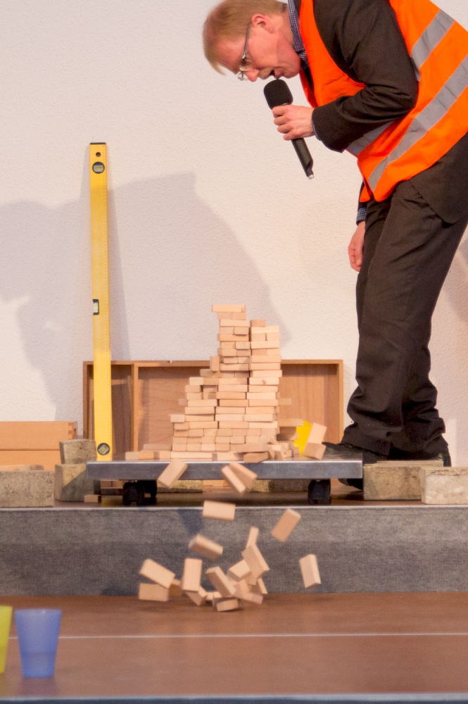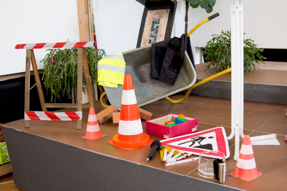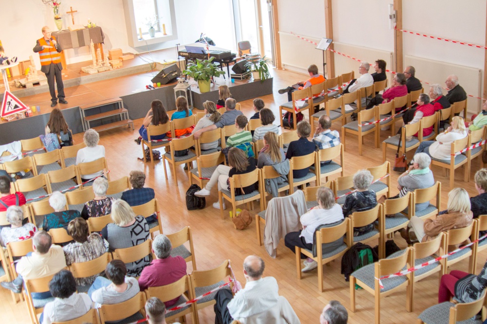Das Thema bauen zog sich durch den ganzen Gottesdienst: Der Saal war mit Schubkarren und Absperrbänder dekoriert, die Mitarbeiter trugen Warnwesten, Helme oder Blaumänner und im Hintergrund erklang oft der Song von Bob, dem Baumeister an „Ja, wir schaffen das!“