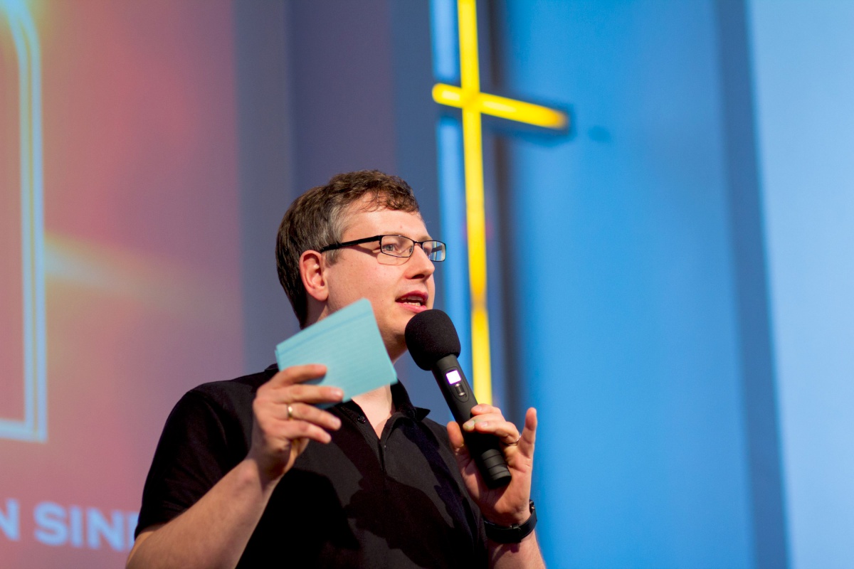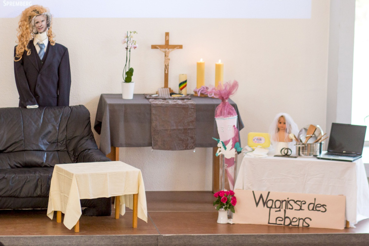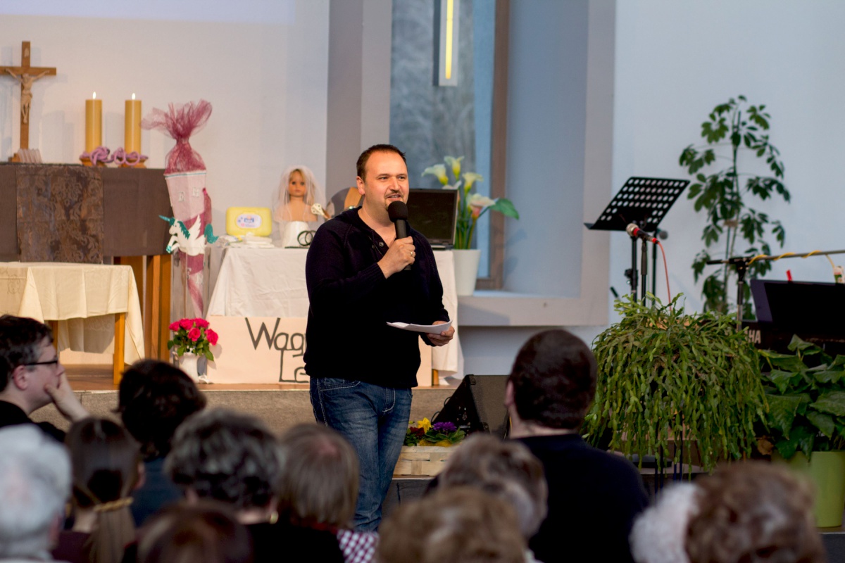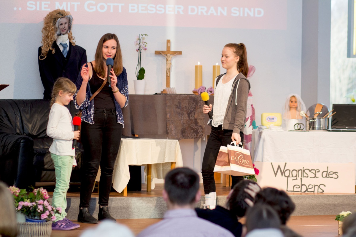 Das Thema „Wetten, dass Sie mit Gott besser dran sind?! – Wagnis des Glaubens“ zog sich durch das ganze Programm. Die Bühne war dekoriert mit einer Thomas-Gottschalk-Puppe und verschiedener Symbole, die an die Wagnisse im Leben erinnern, die wir tagtäglich angehen: Essen, Kinder, Beruf, Heirat…