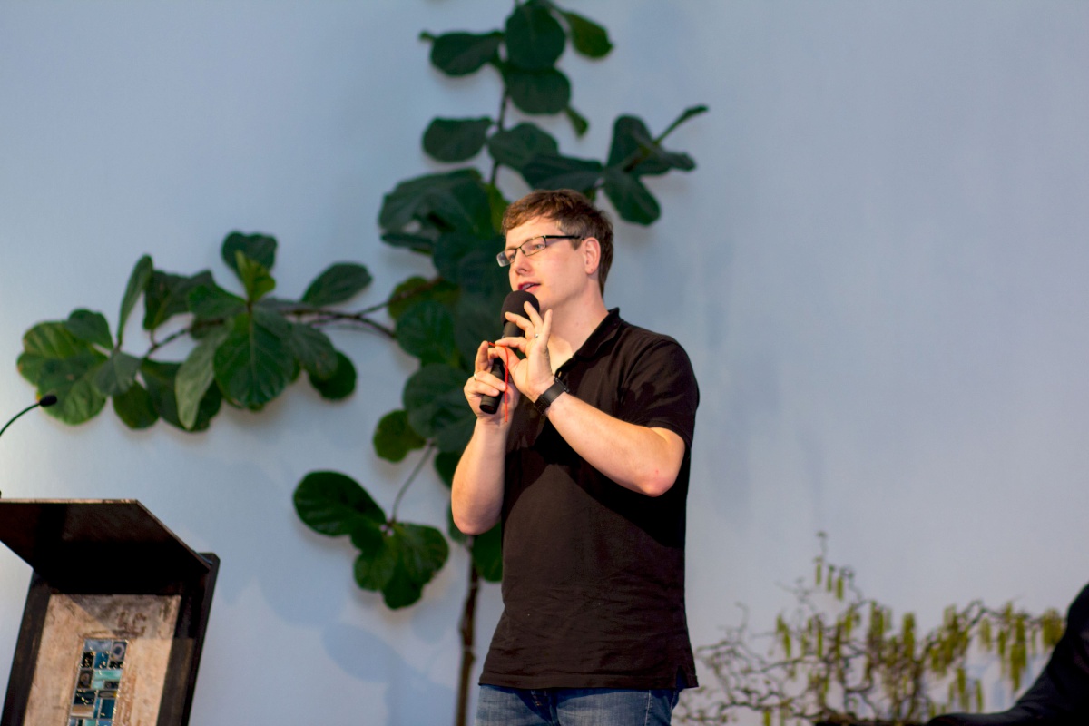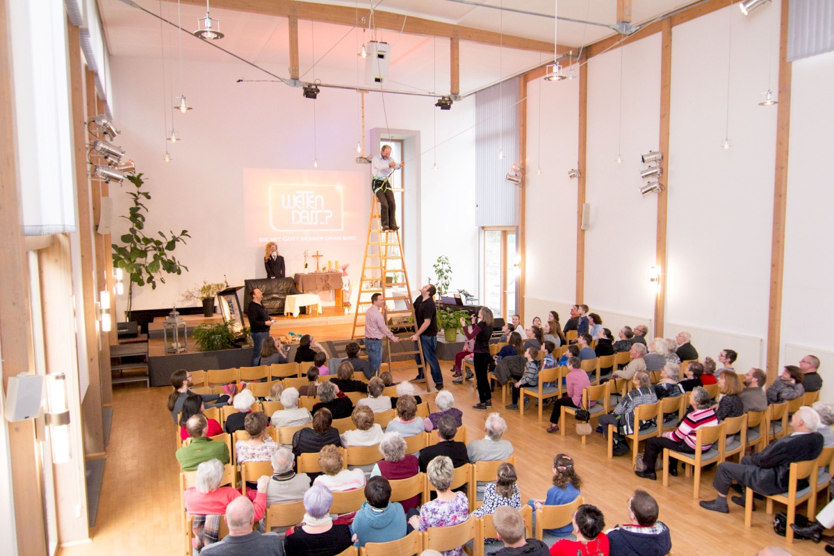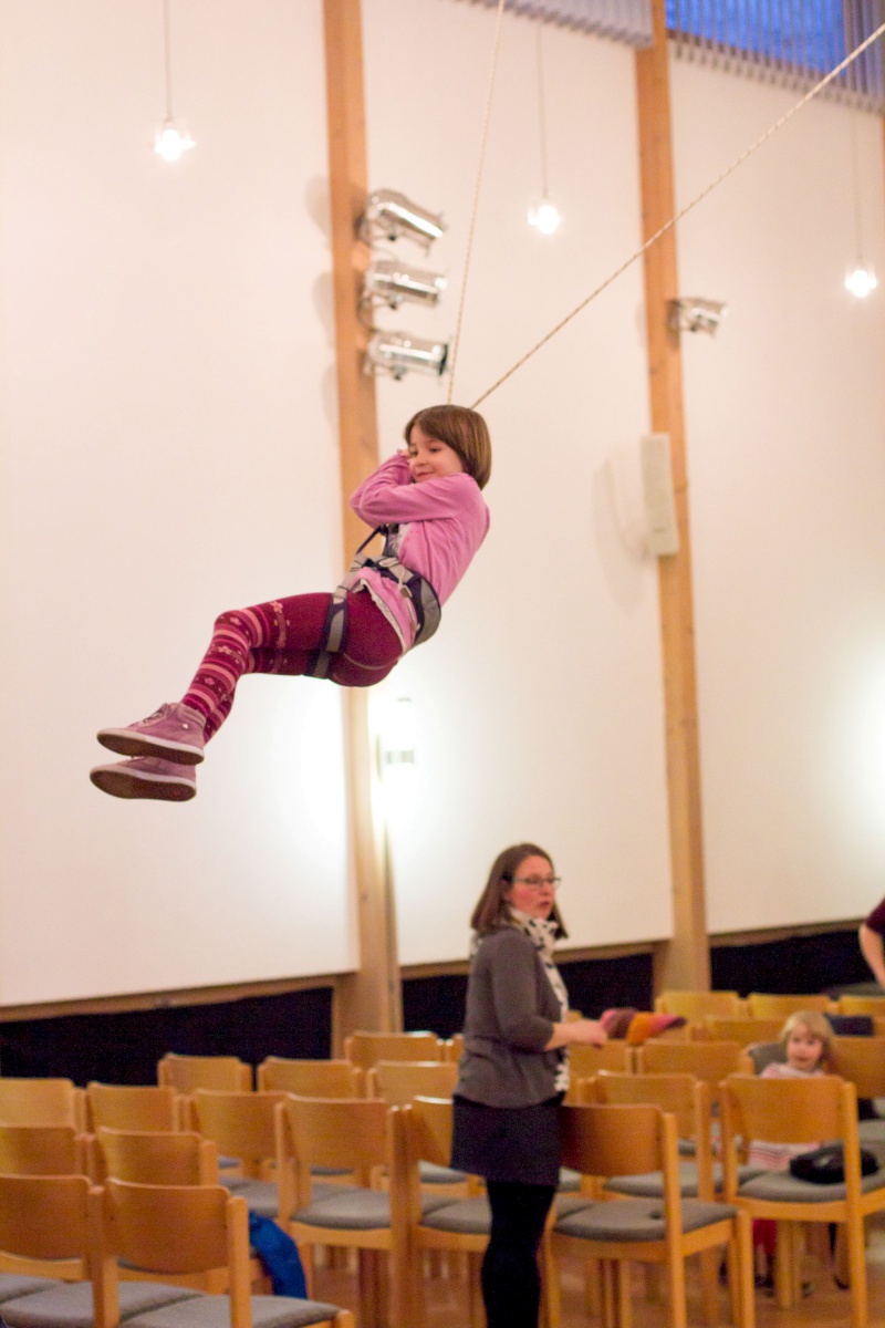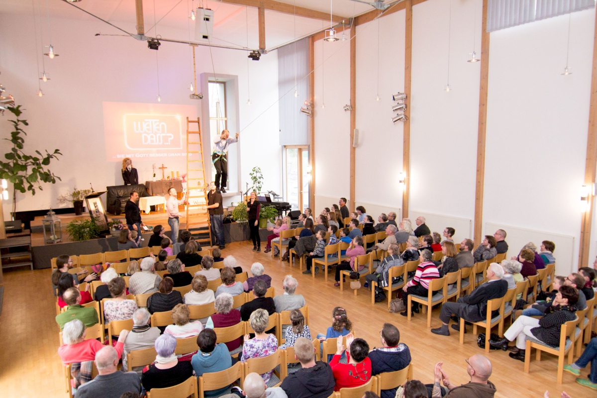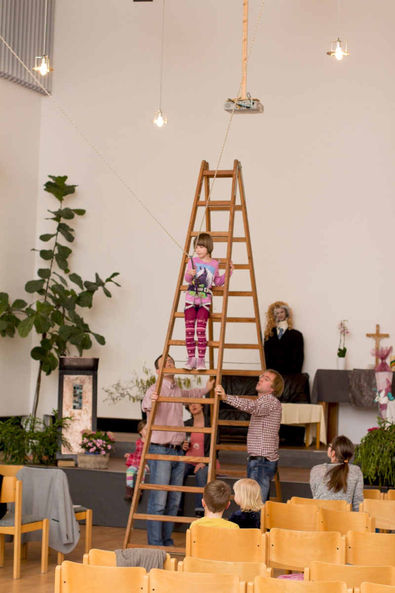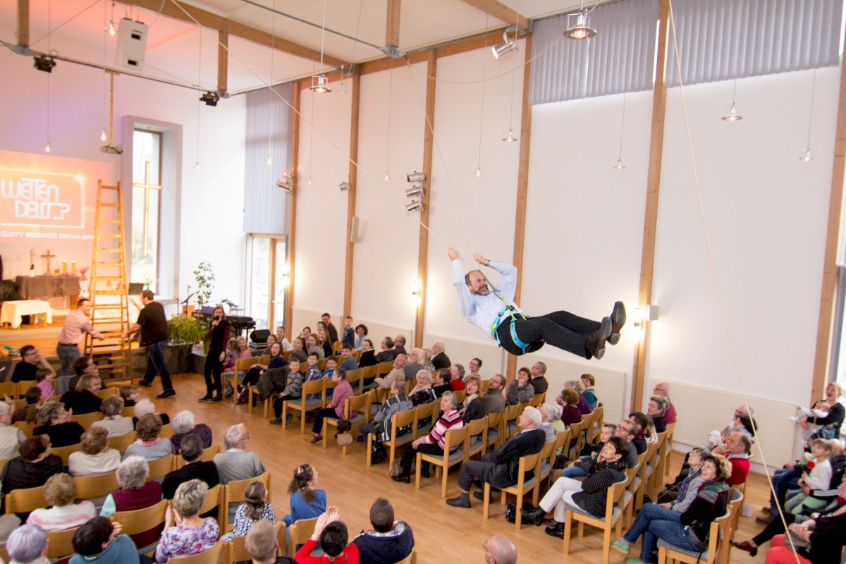 Ein Gottesdienstbesucher mit viel Mut, durfte ein besonderes Wagnis eingehen. An der Bühne stand eine 4-m-hohe Leiter, an der Decke waren Kletterseile befestigt und dann ging es darum, von der Leiter zu springen und durch den Saal zu schwingen – natürlich gesichert durch einen Klettergurt. Es kostete aber trotzdem Überwindung, sich fallen zu lassen und darauf zu vertrauen, dass die Konstruktion hält.