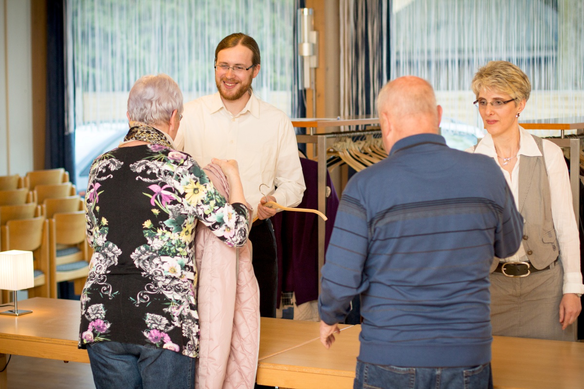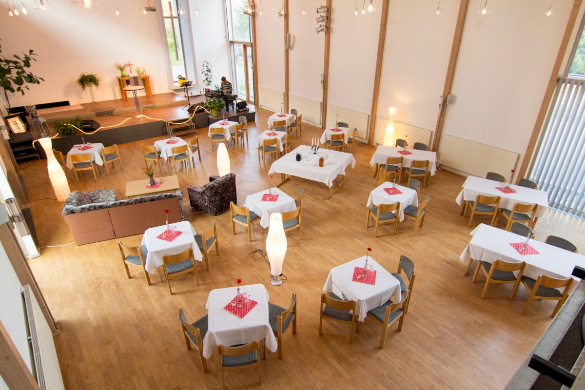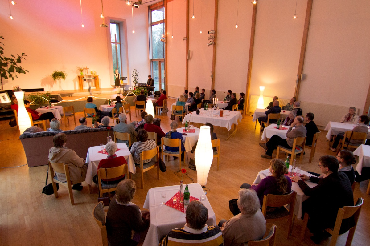 „Wie viel Anerkennung braucht der Mensch?“ war das Thema des letzten Themenabends am 15. April in unserer Gemeinschaft. Um das Thema den Gästen von Anfang an nahe zu bringen, wurde unser Gemeinschaftshaus komplett umgeräumt. Im Saal wurden die Hälfte aller Stühle ausgeräumt und dafür kleine Tische gestellt, mit 3 bis 4 Stühlen drumherum. Mit weißen Tischdecken und liebevoll gestalteter Deko, weißen Stehlampen und einer Sofaecke wirkte der Saal sehr gemütlich und einladend. Die Cafeteria wurde zur Garderobe. Zwei Mitarbeiter standen bereit und nahmen den Gästen die Jacken ab.