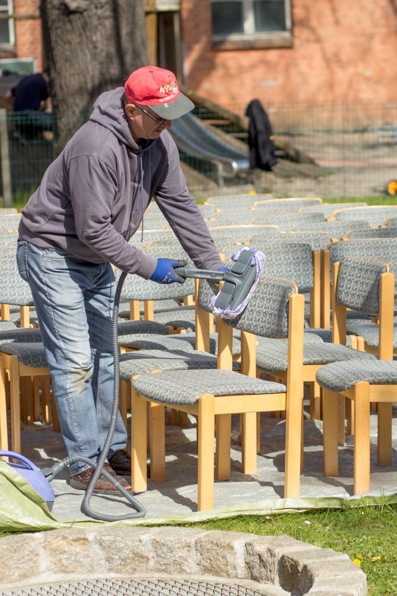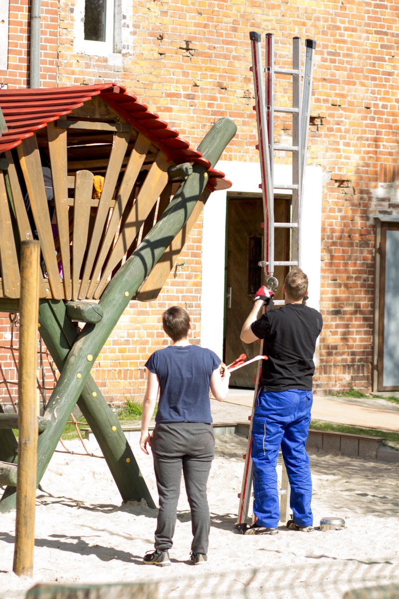 Pünktlich um 8:00 Uhr starten wir. Basti und Torsten verteilen die Ankommenden zu den verschiedenen Arbeitsprojekten: Reinigung in der Kita und im Gemeindehaus, Unkrautjäten auf dem Volleyballplatz, im Klanggarten und in den Rabatten, Reparaturen und Ausbesserungen auf dem Spielplatz, Schleifen und Streichen der Fensterfaschen und und und