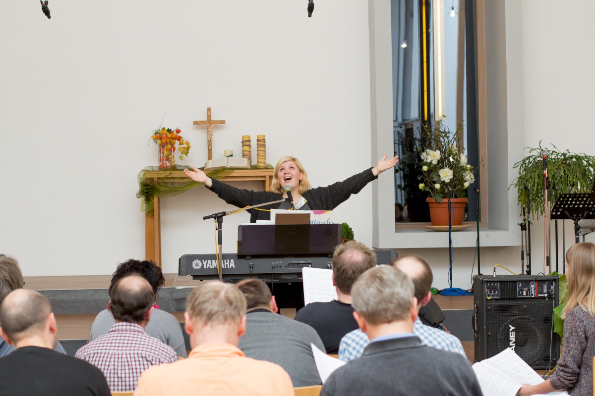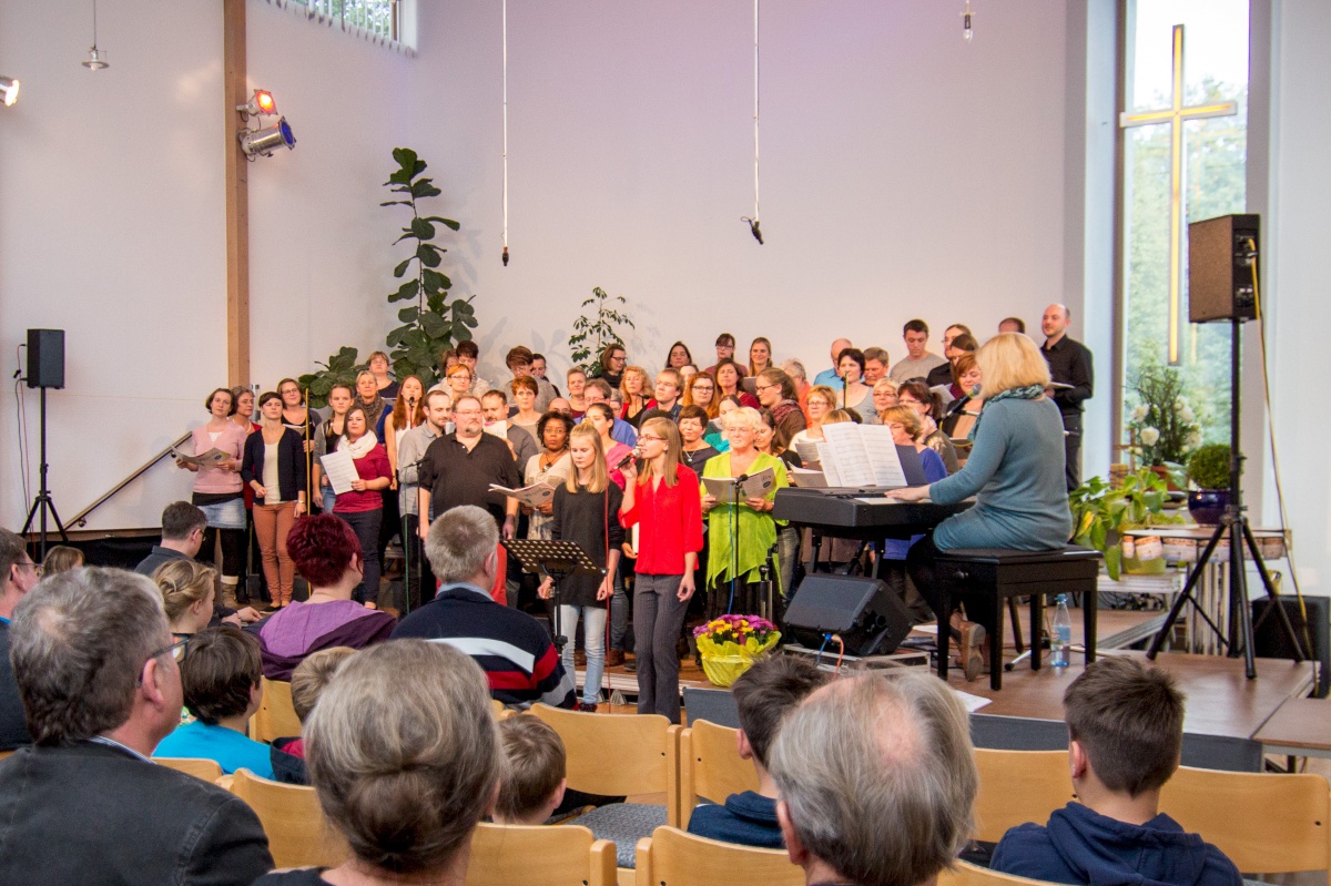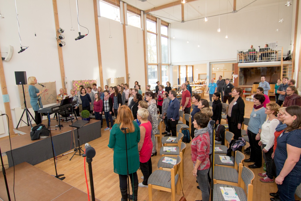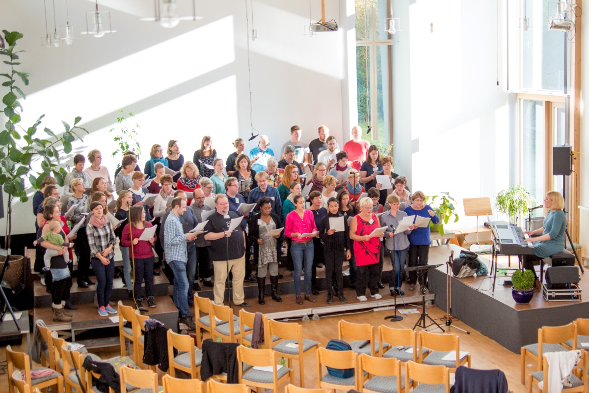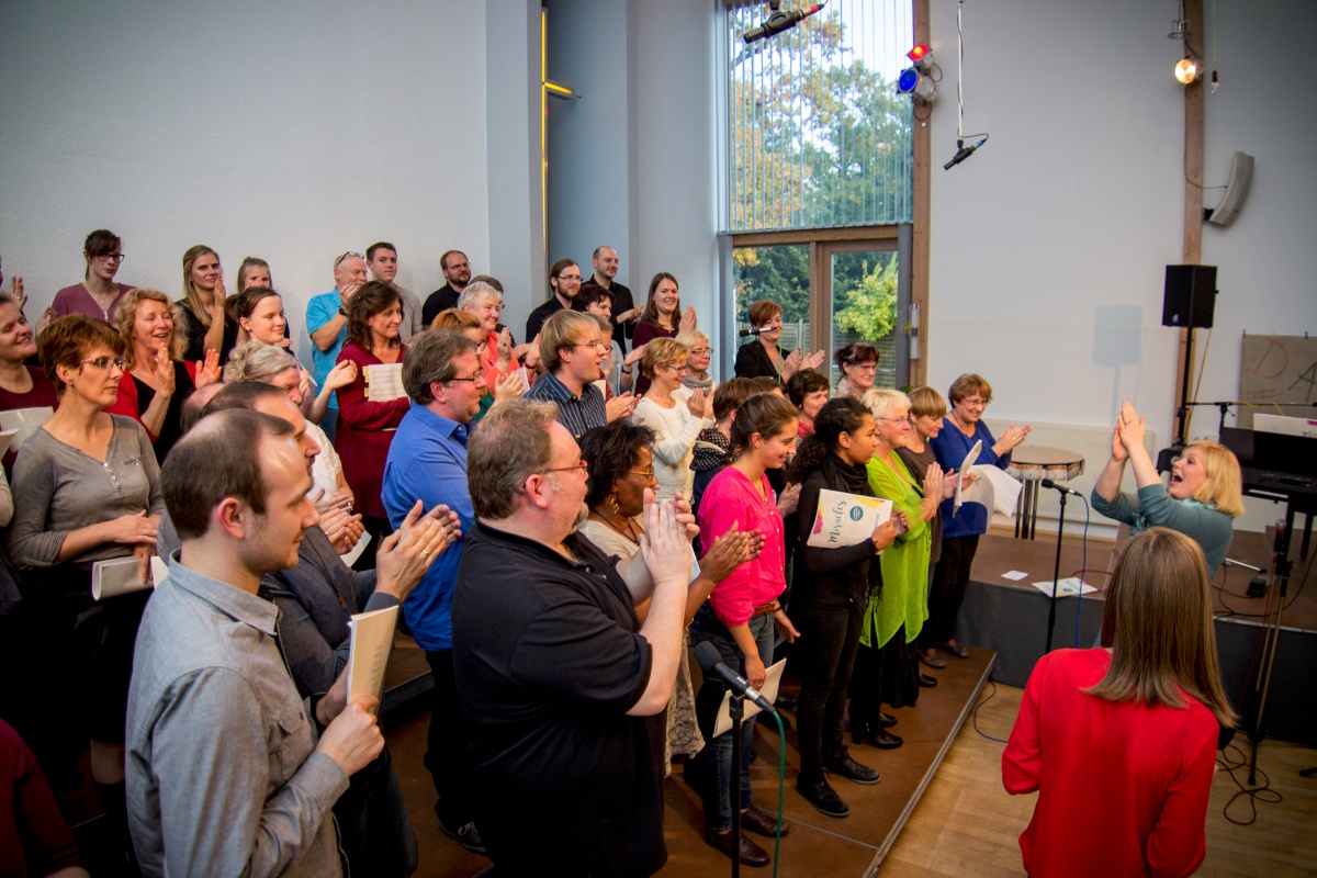 57 Sängerinnen und Sänger hatten sich zum Workshop mit Miriam Schäfer angemeldet und sind voll auf ihre Kosten gekommen. Sieben berührende und bewegende, rockige und balladige, melancholische und fröhliche Lieder wurden 4-stimmig innerhalb der 2 Tage einstudiert. Mit viel Leidenschaft, Professionalität und Liebe brachte Miriam dem Chor ihre eigenen Lieder bei und hatte auch immer wieder gute Tipps zur Gesangstechnik und Ausstrahlung parat. Beim Abschluss-Gottesdienst zeigte der Projektchor was er gelernt hatte und begeisterte Alt und Jung im Publikum.