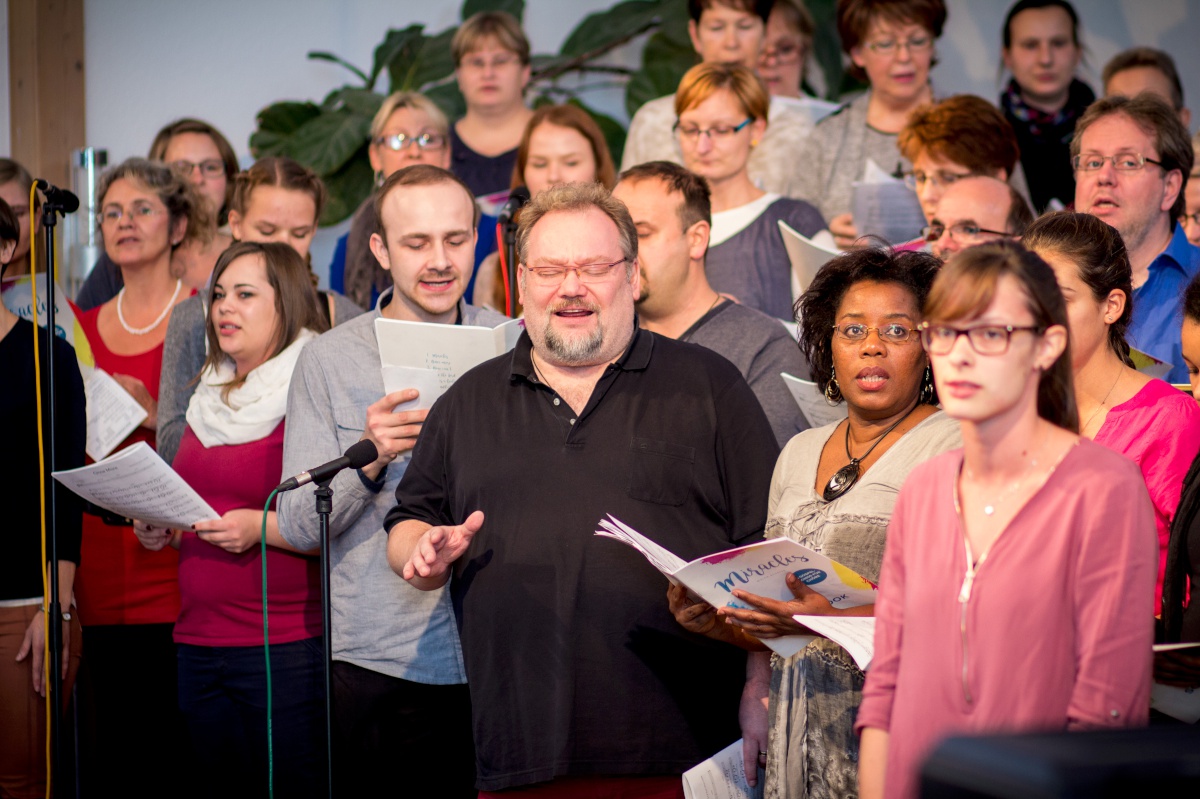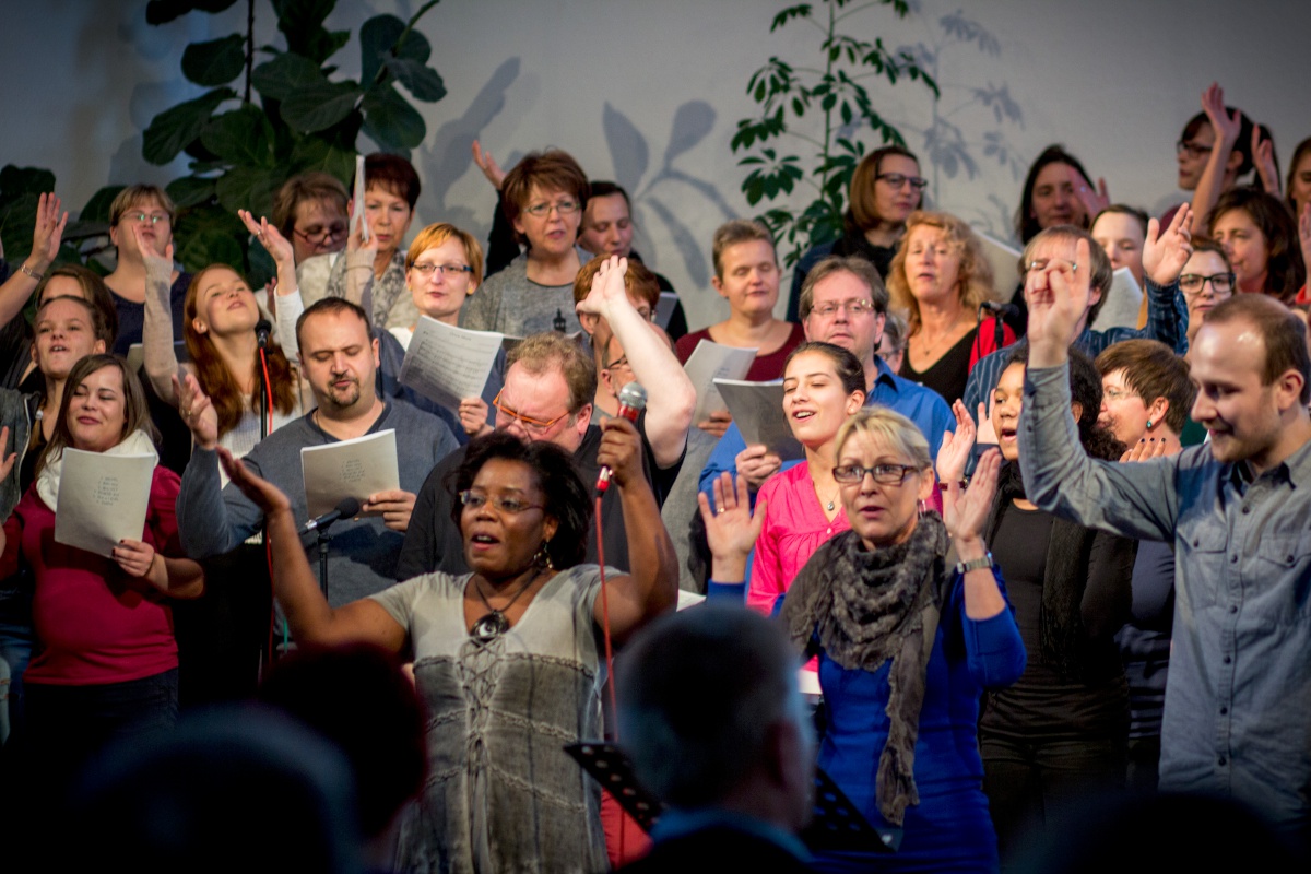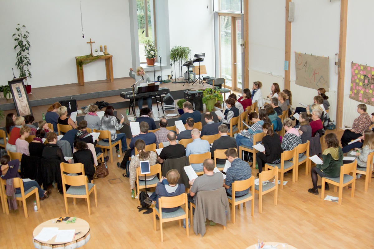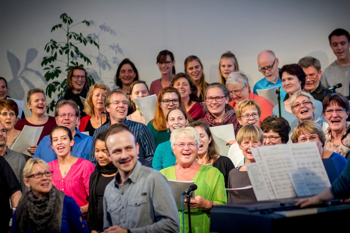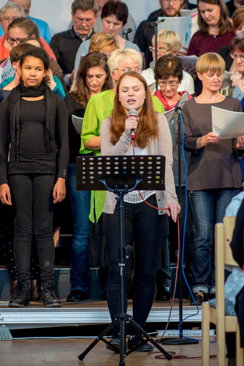57 Sängerinnen und Sänger hatten sich zum Workshop mit Miriam Schäfer angemeldet und sind voll auf ihre Kosten gekommen. Sieben berührende und bewegende, rockige und balladige, melancholische und fröhliche Lieder wurden 4-stimmig innerhalb der 2 Tage einstudiert. Mit viel Leidenschaft, Professionalität und Liebe brachte Miriam dem Chor ihre eigenen Lieder bei und hatte auch immer wieder gute Tipps zur Gesangstechnik und Ausstrahlung parat. Beim Abschluss-Gottesdienst zeigte der Projektchor was er gelernt hatte und begeisterte Alt und Jung im Publikum.