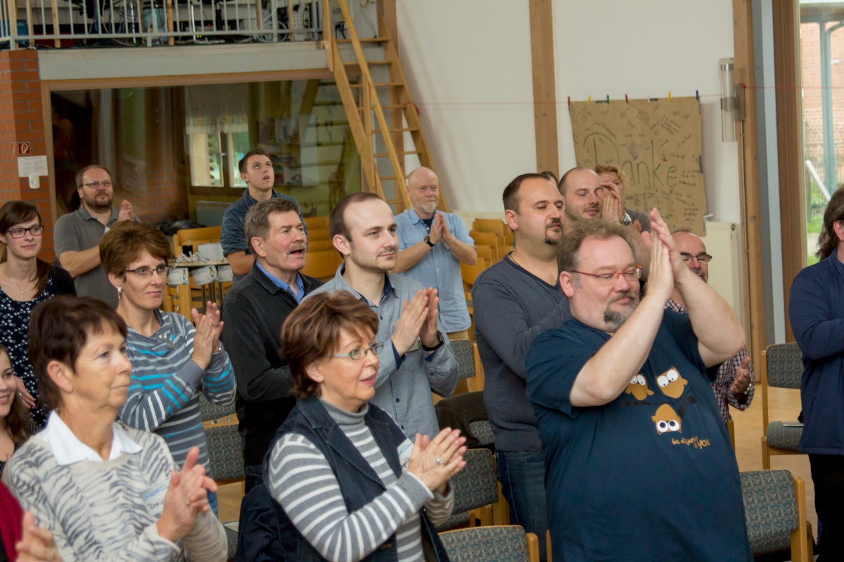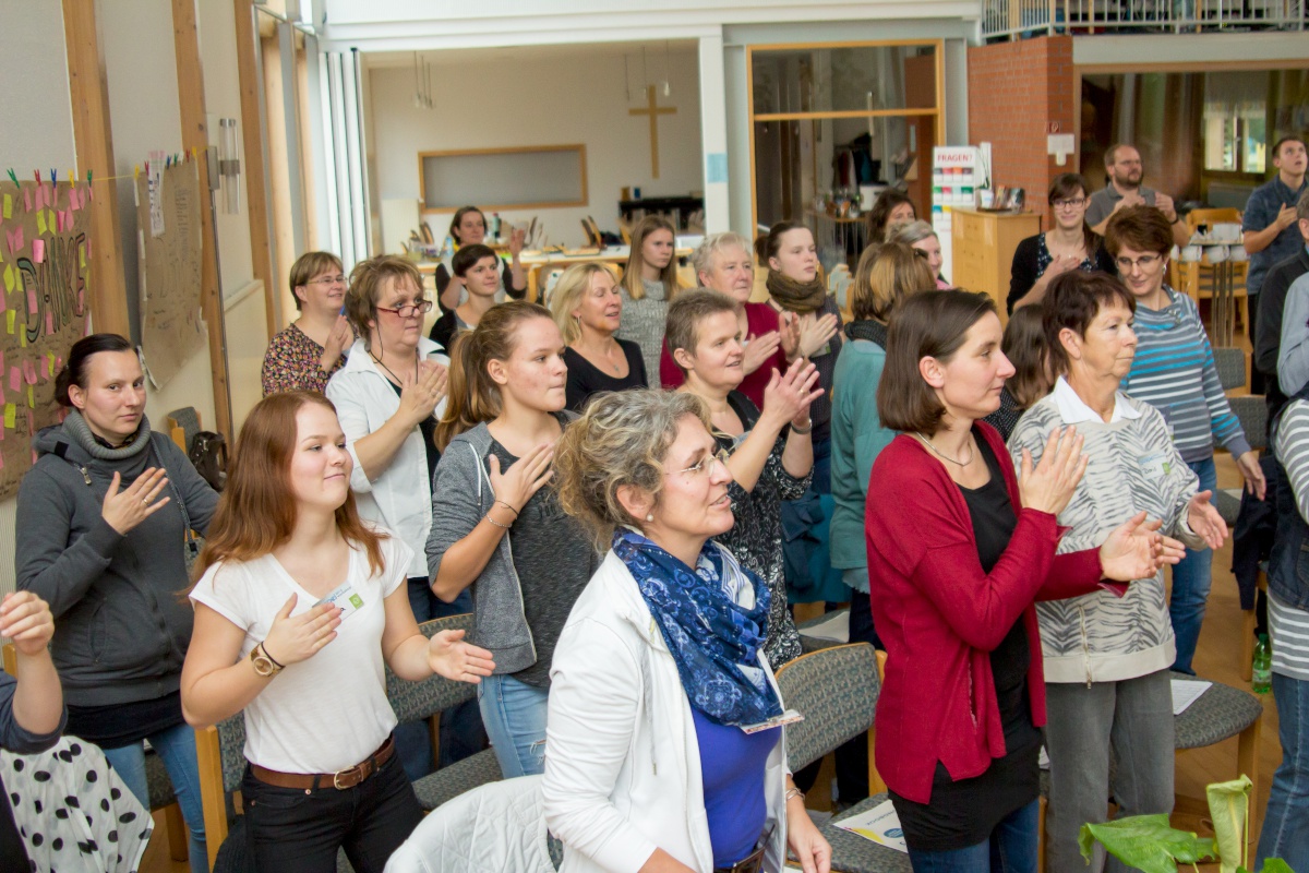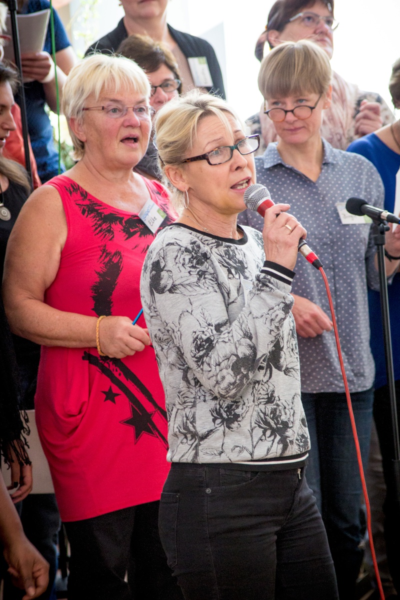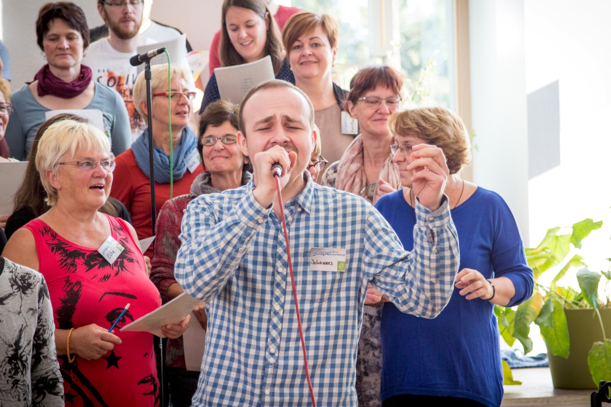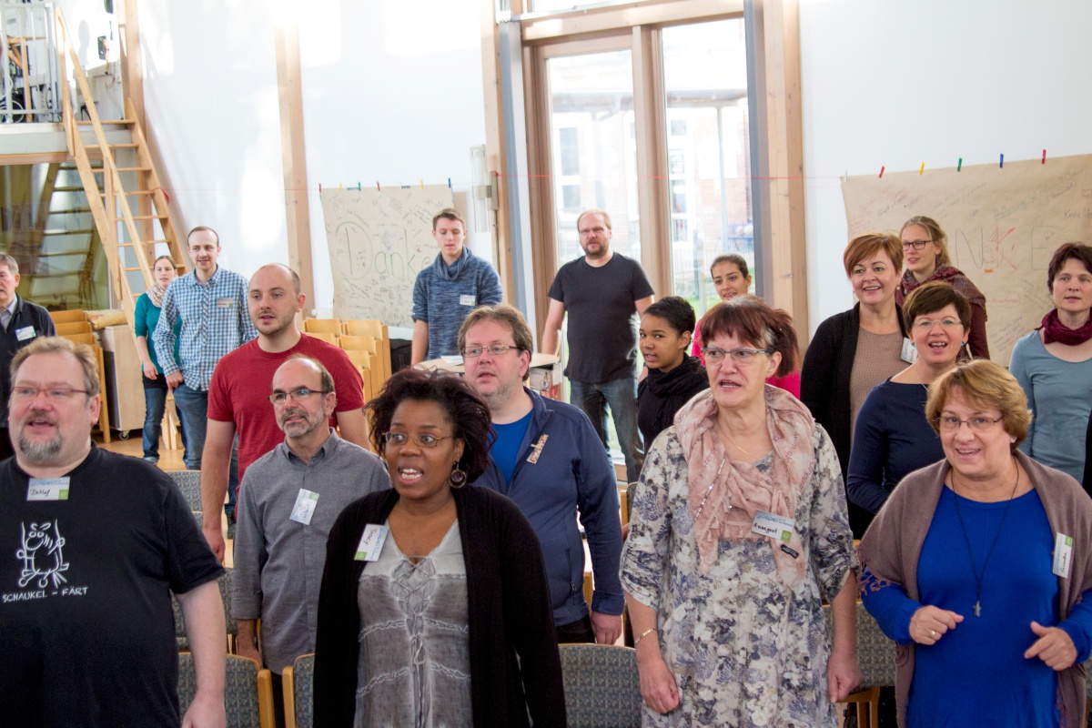 57 Sängerinnen und Sänger hatten sich zum Workshop mit Miriam Schäfer angemeldet und sind voll auf ihre Kosten gekommen. Sieben berührende und bewegende, rockige und balladige, melancholische und fröhliche Lieder wurden 4-stimmig innerhalb der 2 Tage einstudiert. Mit viel Leidenschaft, Professionalität und Liebe brachte Miriam dem Chor ihre eigenen Lieder bei und hatte auch immer wieder gute Tipps zur Gesangstechnik und Ausstrahlung parat. Beim Abschluss-Gottesdienst zeigte der Projektchor was er gelernt hatte und begeisterte Alt und Jung im Publikum.