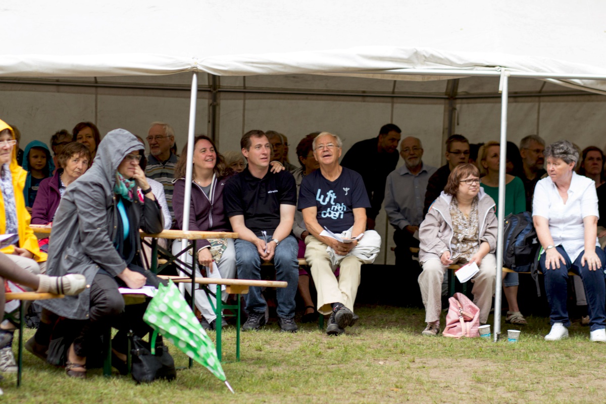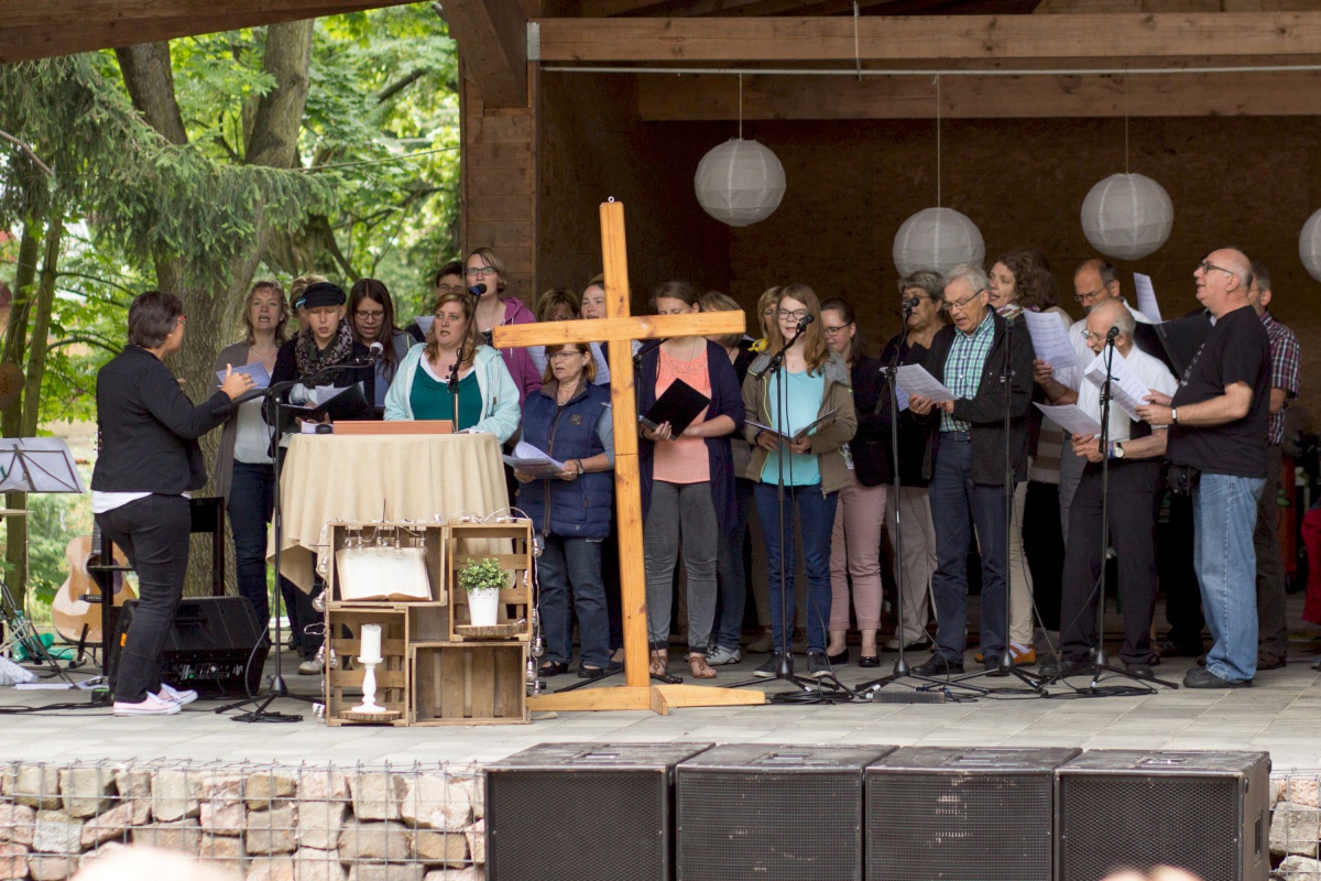 Wir trafen uns auf der Maiwiese unter freiem Himmel. Obwohl uns immer wieder einige Regenschauer heimsuchten, war es ein besonders gelungener Tag. Der Gottesdienst traf ins Herz mit Musik von Band, Chor und Bläsern, mit Geschichten und Bildern von „Radieschenfieber“ und mit Worten von Oliver Ahlfeld.