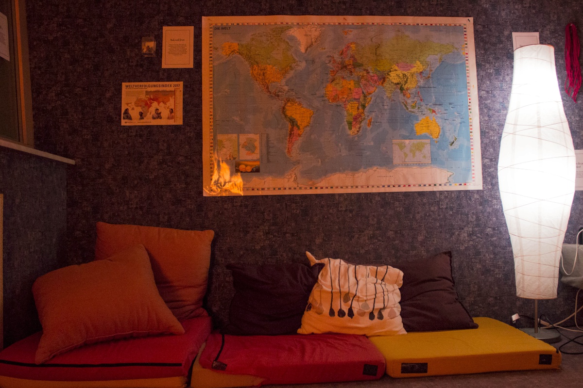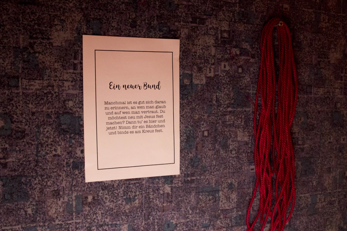 Eine Woche vorher traf sich das Vorbereitungsteam, um sich kreative Stationen einfallen zu lassen und mit Hilfe der Jungen Gemeinde Spremberg wurde der Raum eingerichtet. Ein paar Details über einzelne Stationen und den Raum: Eine große Scheibe schmückte sich mit Danksagungen und ein Anfangs kahler Baum wurde von Erlebnissen mit Gott bestückt. Für Menschen auf der ganzen Welt wurde gebetet, wobei an einer Weltkarte mit Pinnnadeln die Orte markiert wurden. Wenn man für konkrete Menschen gebetet hatet, konnte man als Zeichen dafür ein Strichmännchen an ein Banner malen. Für die Schuld, die uns tagtäglich belastet, gab es auch eine Station. Dort schrieb man seine Schuld auf eine Folie mit einem normalen Stift und ließ sie dann einfach durch Wasser wegwaschen. Ebenfalls stand in dem Raum eine große Vase, dort konnte man seine Klagen auf einem Zettel festhalten, in die Vase werfen und unter Erde begraben. Verschiedene Kissen, Lichter und Tüchersorgten für eine gemütliche Atmosphäre. Hinter einem Altar, auf welchem eine Bibel mit vielen Lesezeichen lag, stand ein großes Kreuz, dort konnte man Bänder festbinden als Zeichen dafür, dass man mit Jesus festgemacht hat. Zudem stand auch noch Musik zur Verfügung, sowohl in der Art von Instrumenten und Liederbüchern, als auch durch CDs.