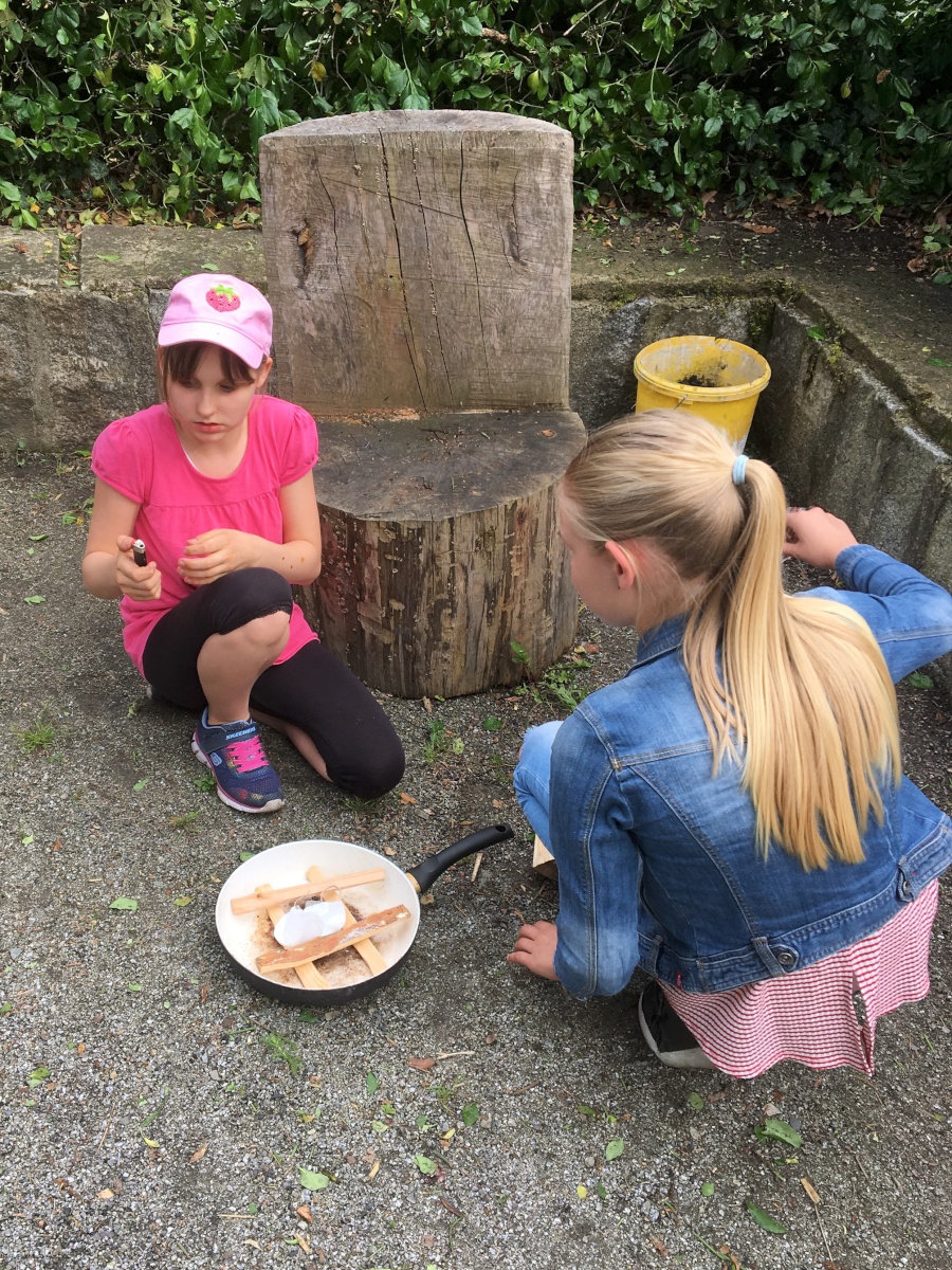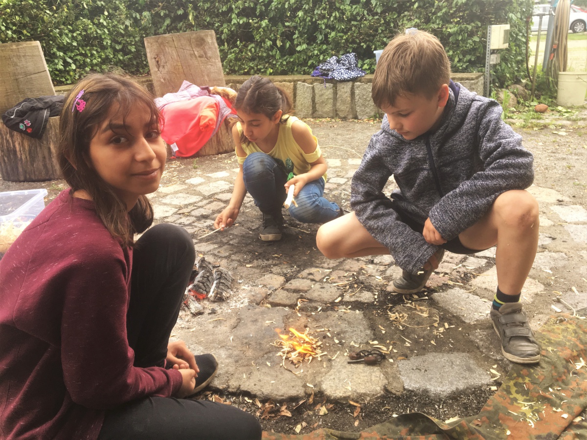 Ein „Schnitzmesser-Führerschein“ wurde bereits abgelegt, es gibt immer interessante Geschichten zu hören, hin und wieder trifft man sich im Wald und dass die Kleidung der Kids vom Lagerfeuerduft durchzogen ist, kommt auch regelmäßig vor. Bei Wind und Wetter sind die Kids und das Mitarbeiter-Team an der frischen Luft, notfalls wird auch mal eine Regenplane gespannt 🙂
