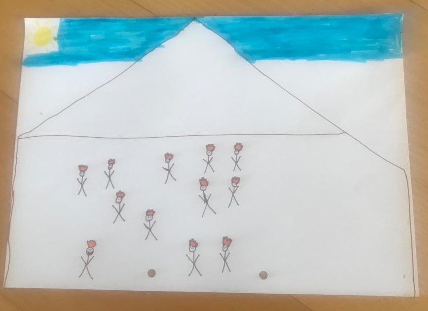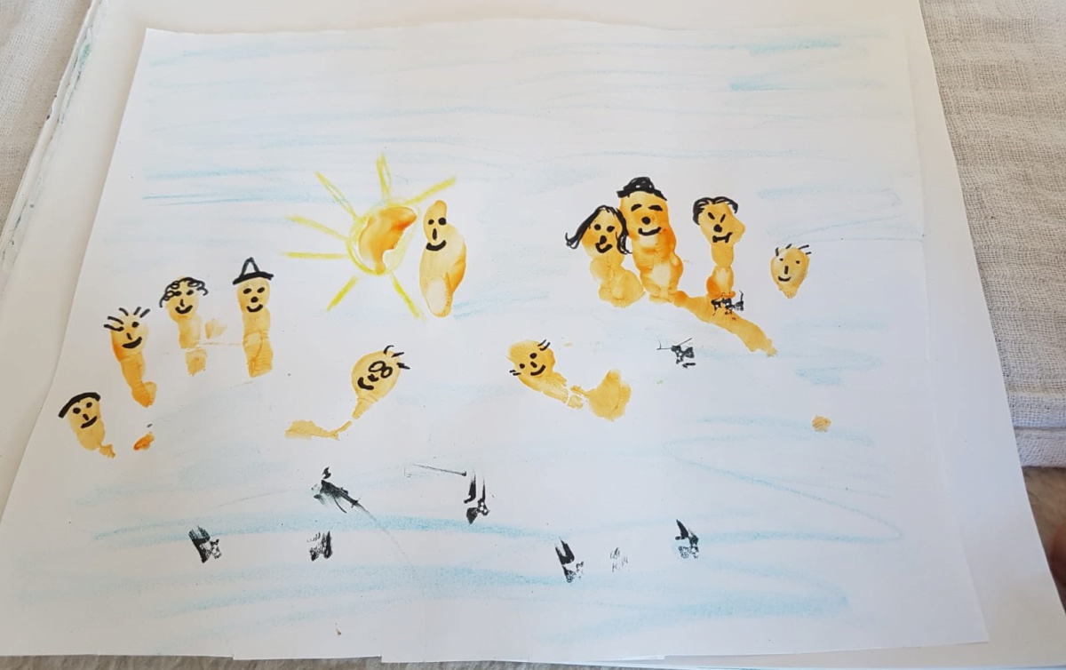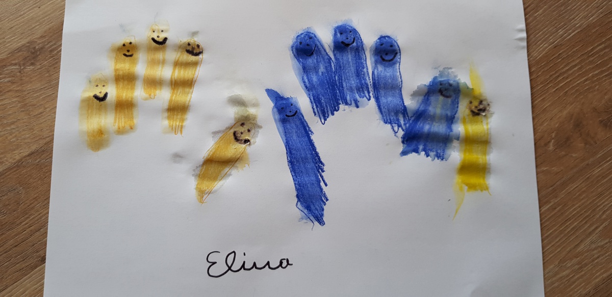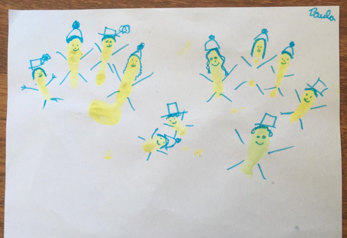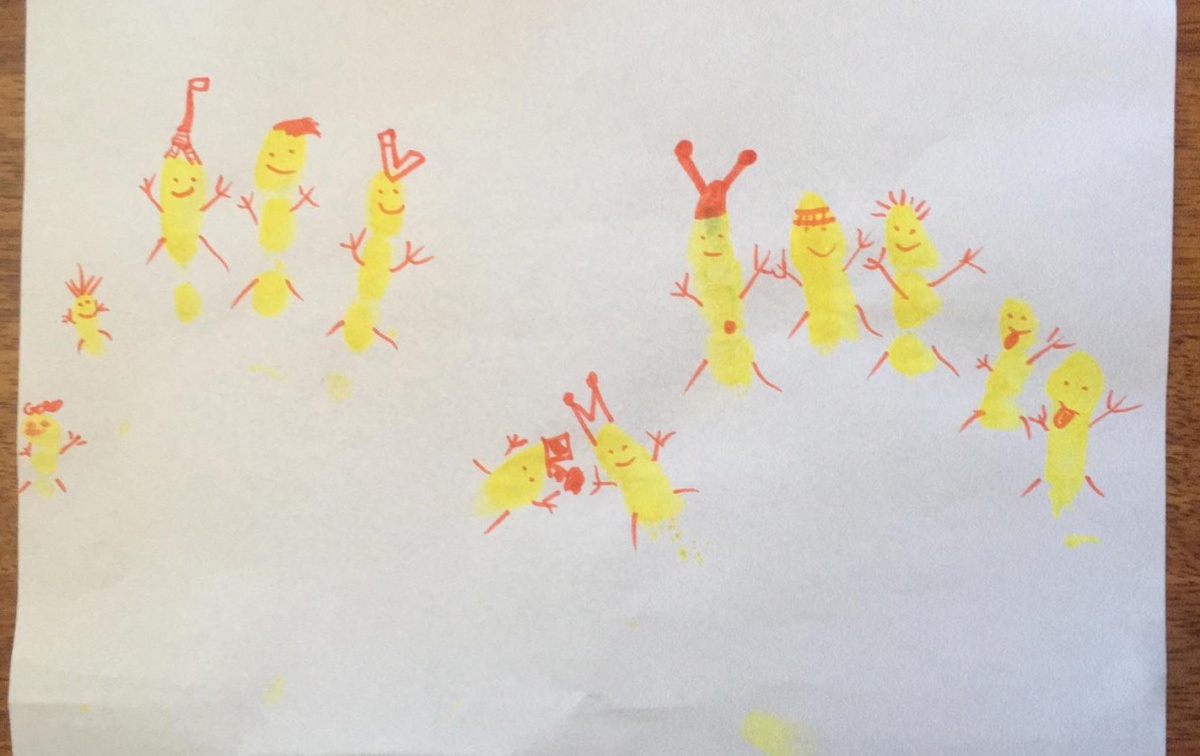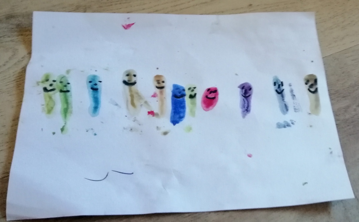 Die Kinder haben in der Kinderstunde mit ihren Fingern gestempelt. Die 10 Jünger und Thomas sind darauf zu erkennen. Die 10 haben Jesus zuerst gesehen, aber Thomas war nicht dabei. Er konnte es nicht glauben, dass Jesus lebt – aber dann hat er ihn selbst gesehen.