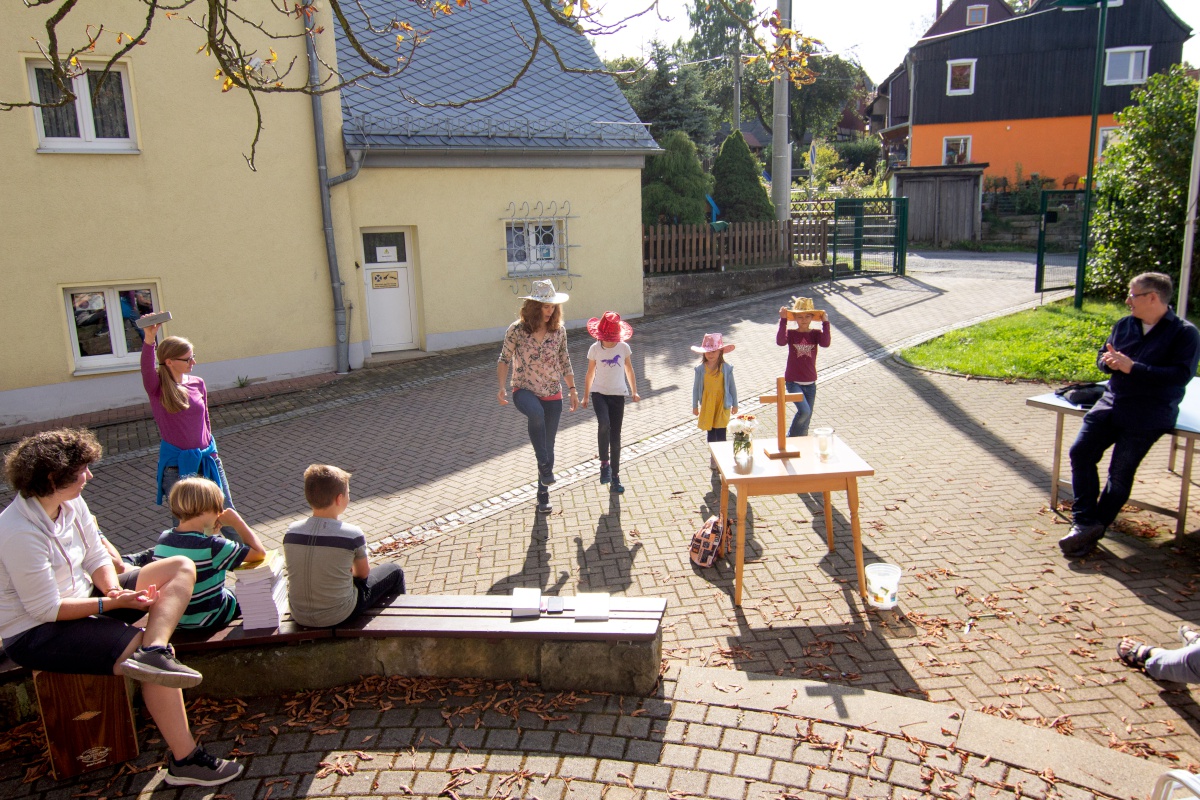 Am Sonntagvormittag war dann schon Koffer packen angesagt. Gemeinsam feierten wir (wieder im Innenhof der Jugendherberge) den Abschlussgottesdienst. Ein paar Mädchen führten sogar einen Cowboy-Tanz auf, den sie tags zuvor im Workshop geübt hatten.