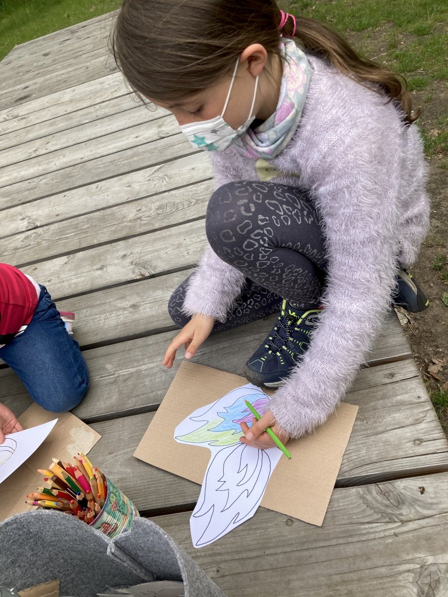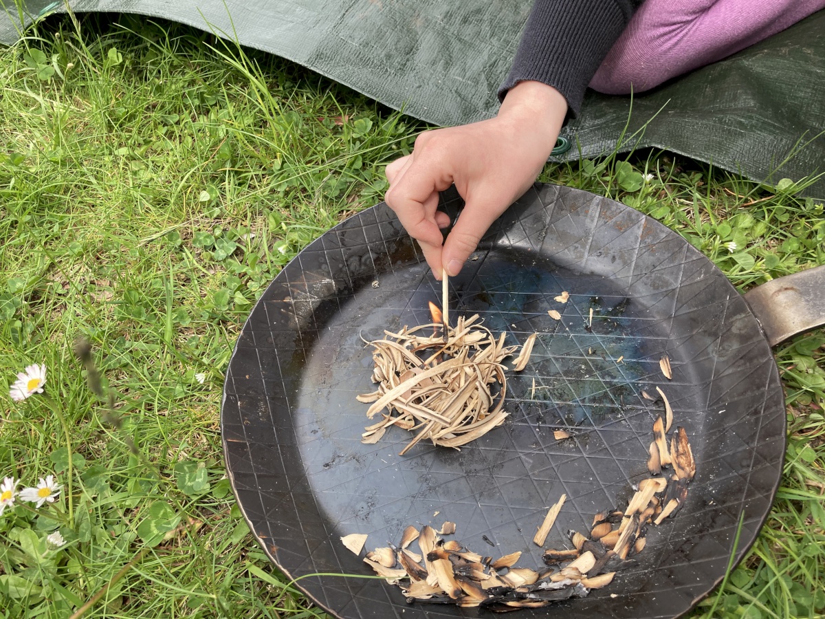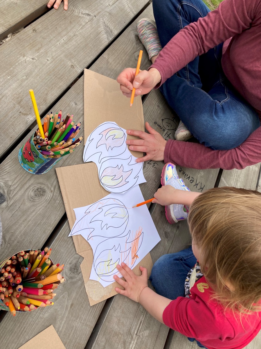 Für alle Kinder von 4 bis 12 Jahren wurde nach dem Kinderlied ein buntes Programm am Schwanteich angeboten: Flammen ausmalen, Spielgeräte ausprobieren, Pfadfinder-Aktion: schnitzen & Feuer entzünden und auch die Handpuppe Norbert war dabei. Norbert hatte das mit dem Feuer zu Pfingsten ein bisschen falsch verstanden – zum Glück konnte Micha die Geschichte erzählen wie sie wirklich war …