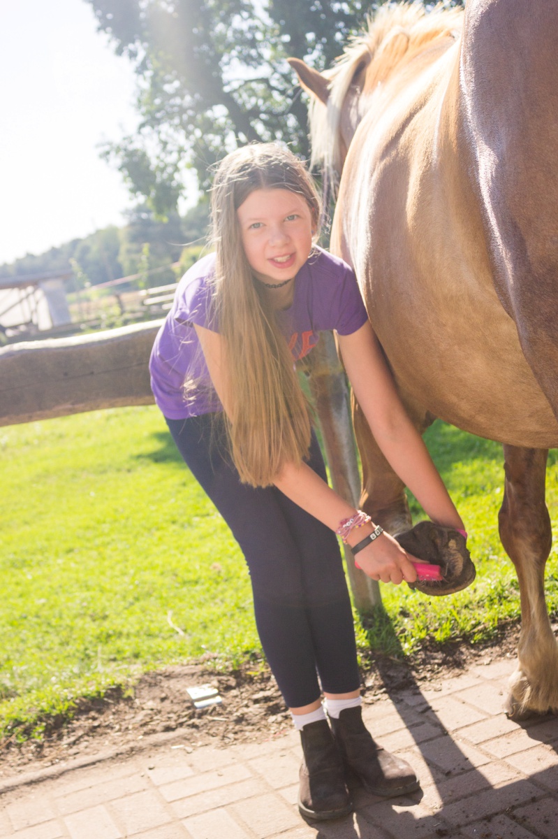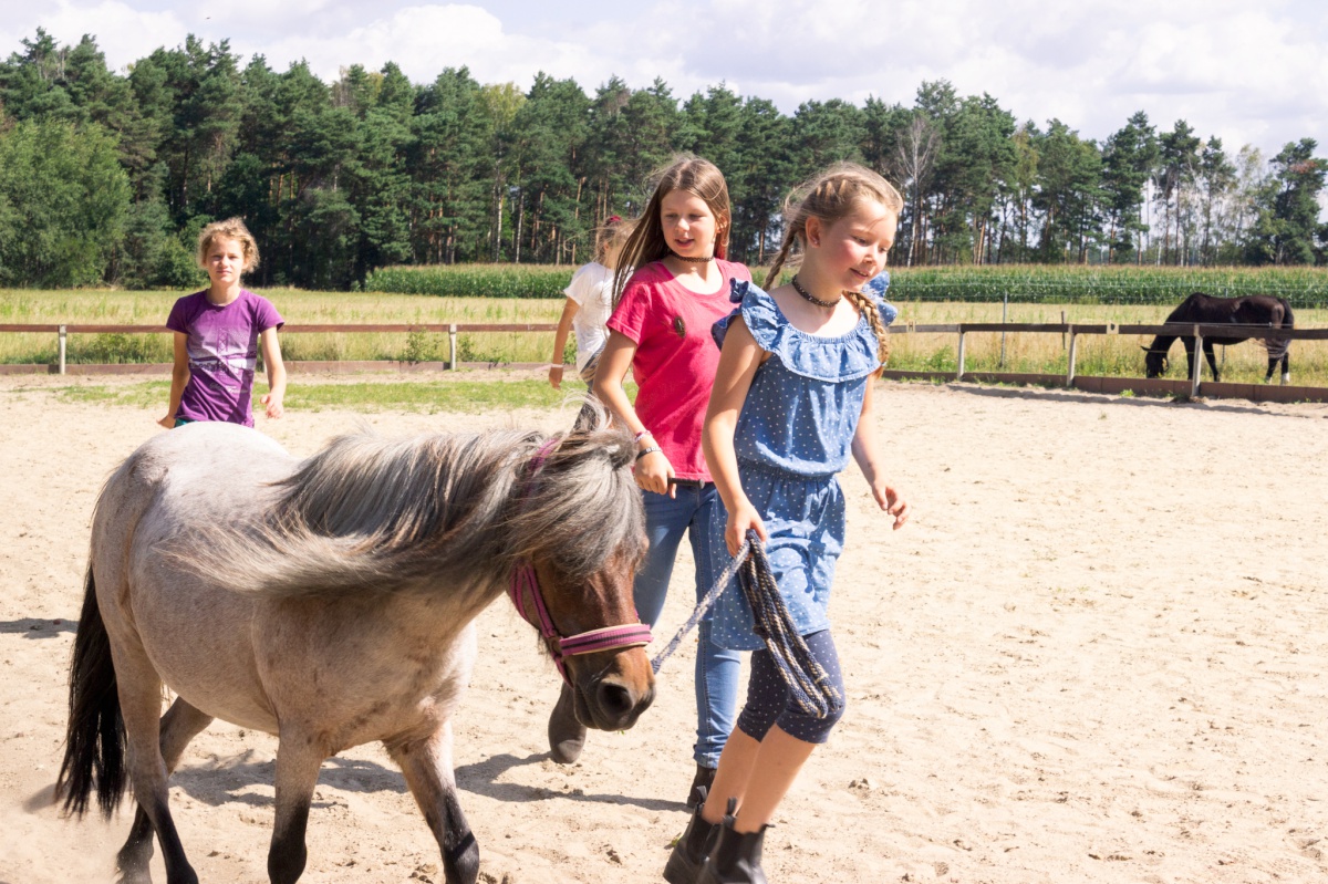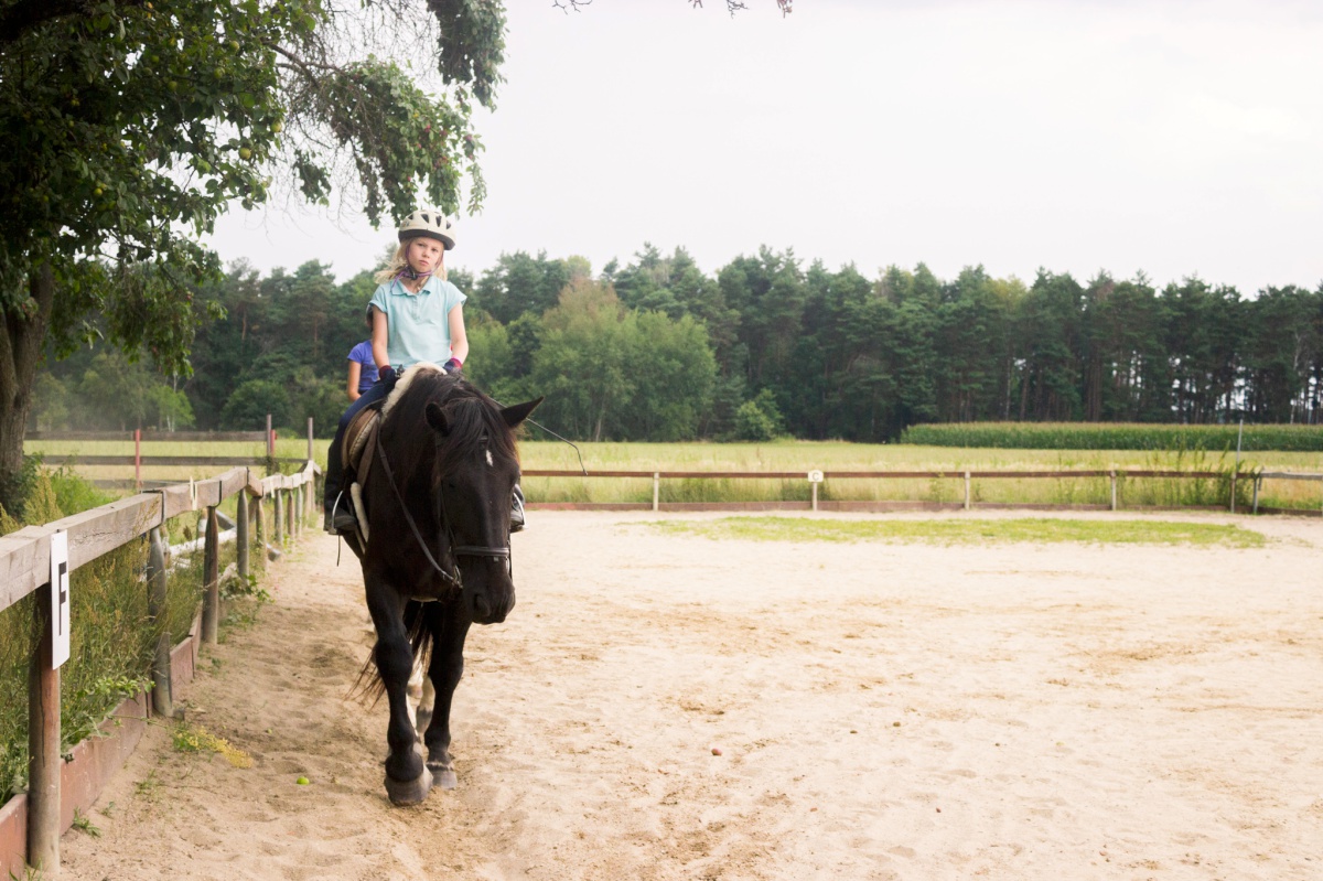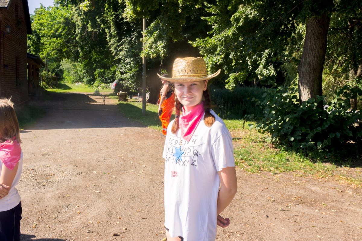 Eine Woche lang haben wir zusammen auf dem Hof verbracht, der sich dieses Jahr in eine Westernranch verwandelte. Und entsprechend sah auch das Programm aus: Die Mädchen hatten Spaß in der Cowgirlschule (egal, ob beim Gummistiefelweitwurf, Lasso binden oder Kühe melken), gestalteten sich ihr eigenes Halstuch, lösten einen aufregenden Kriminalfall (einen Postkutschen-Überfall in Spree-Mountain) und vieles mehr. Das Highlight unserer Cowgirls war natürlich die tägliche Reitstunde.