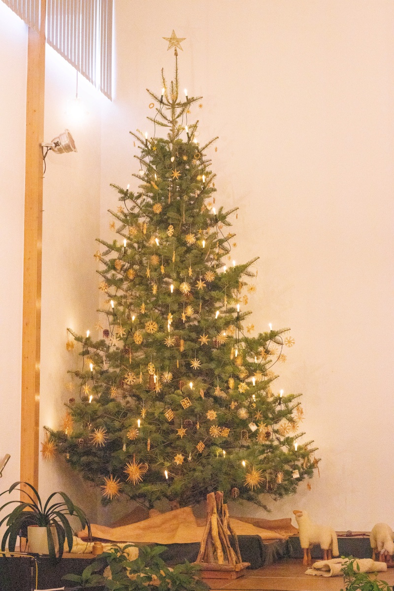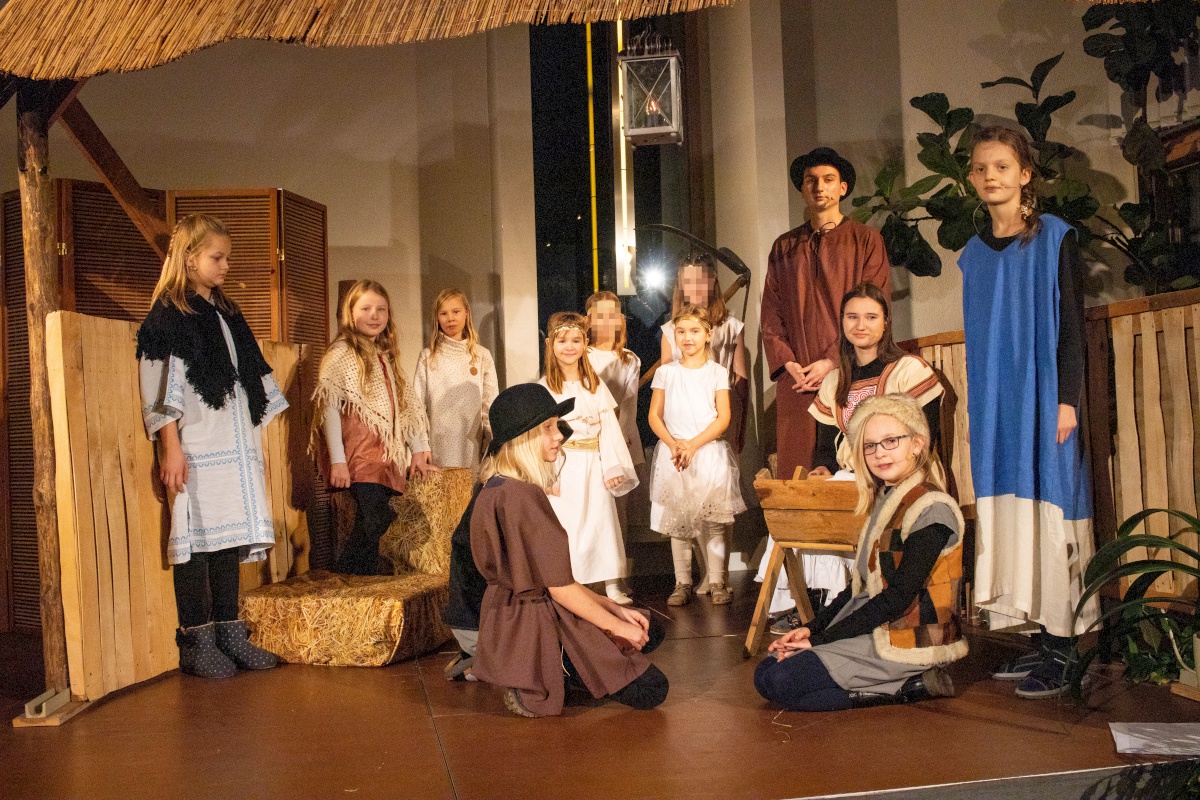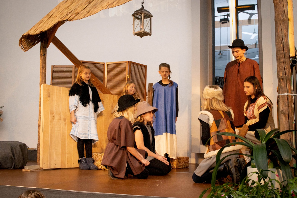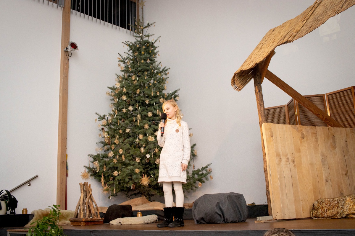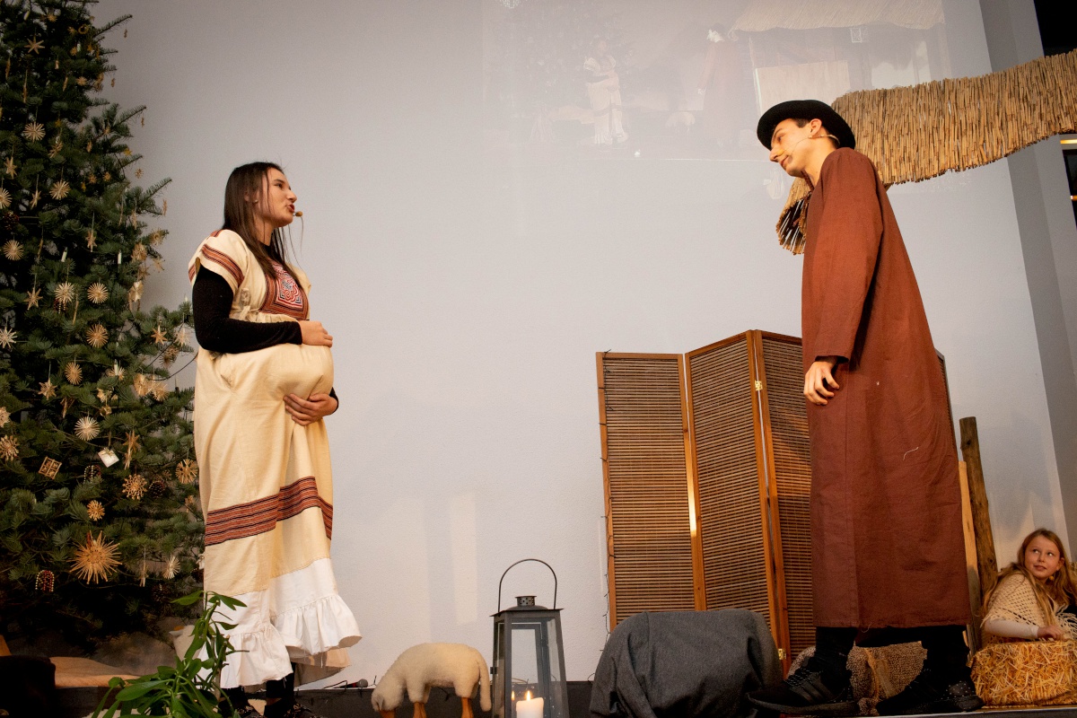 Zwei Stunden später feierten wir u.a. mit vielen Familien den Heilig-Abend-Gottesdienst. Da im Saal nicht mitgesungen werden durfte, lauschten alle Philine und ihrem Papa bei „Gloria“ und „Ich steh an deiner Krippe“. Lisa moderierte und Andreas hielt die Predigt. Der Höhepunkte des Gottesdienstes war das Krippenspiel „Der verborgene Gast“ (von Matthias Mempel). Die Kids hatten in den Workshoptagen fleißig geprobt, viele Mitarbeitende hatten dabei geholfen und Kulissen gebaut, Kostüme geschneidert, Scheinwerfer ausgerichtet und vieles mehr. Das Stück ging glatt über die Bühne und die Besucher:innen wurden mit genommen nach Bethlehem in den Stall.