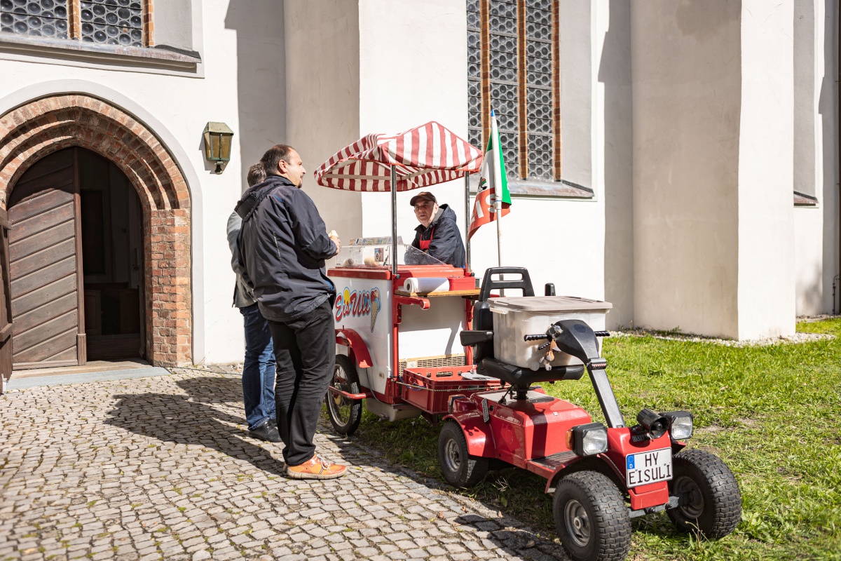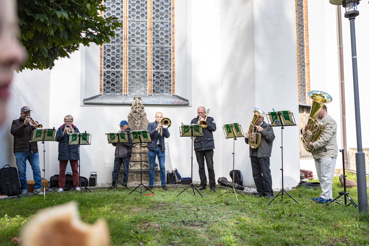 Zur Mittagspause trafen sich alle bei herrlichem Sonnenschein draußen zu Bratwurst und Nudeln. Es gab verschiedene Angebote: Agenten-Stadtspiel für die Teens und Jugend, Wunschliedersingen, Bläser-Ständchen, Eis-Wagen und eine Besichtigung vom Fish-Haus Jakob. Viele nutzen die Zeit auch für Gespräche und einen Einkauf am Büchertisch.