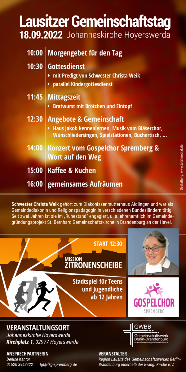Der Nachmittag begann mit einem Konzert des Gospelchores Spremberg, der mit sehr viel Leidenschaft die Kirche mit wunderbaren Liedern füllte. Schw. Christa Weik gab ein Wort mit auf den Weg und dann ging es auch schon zu Kaffee, Kuchen und zum Aufräumen.