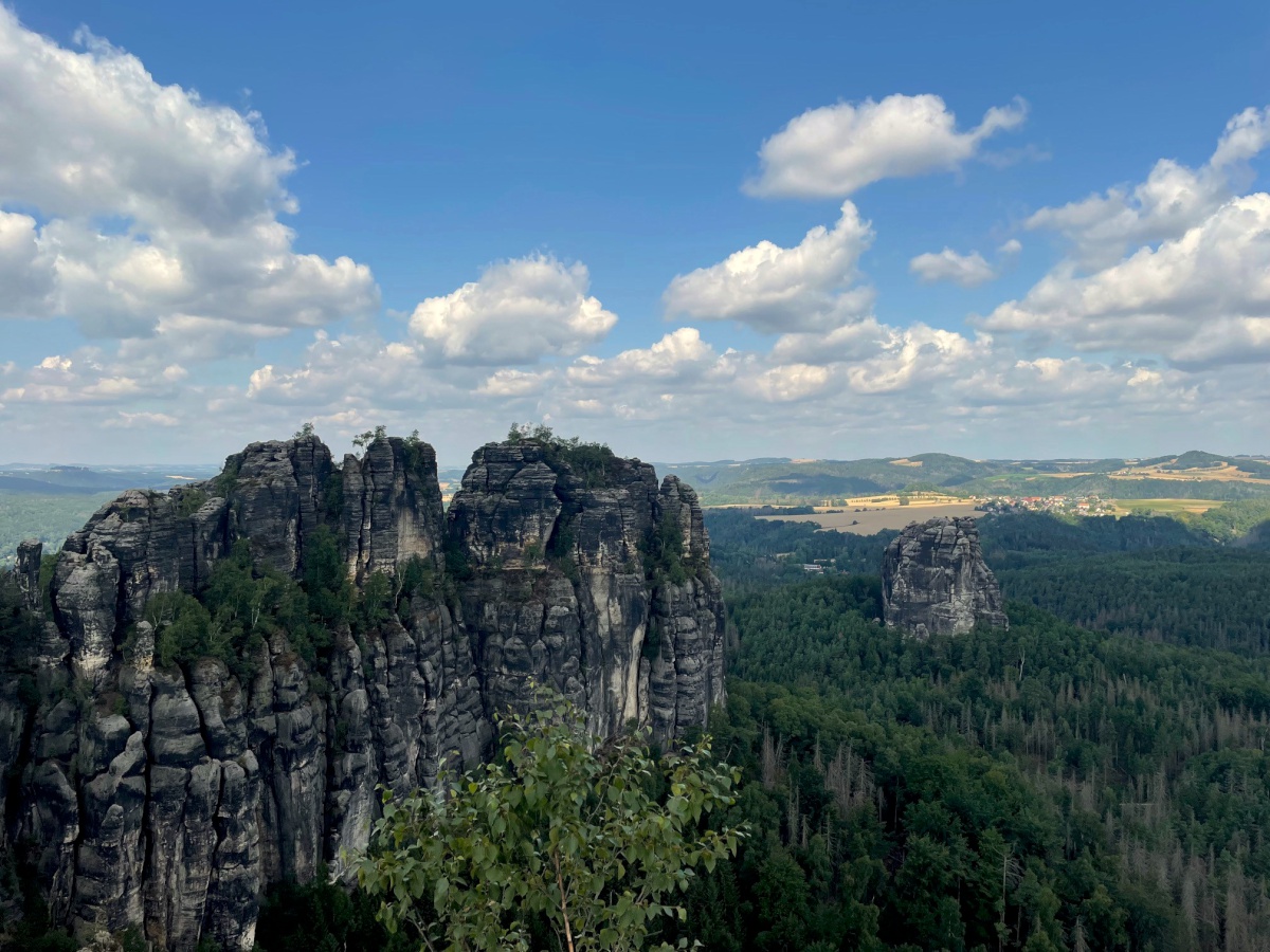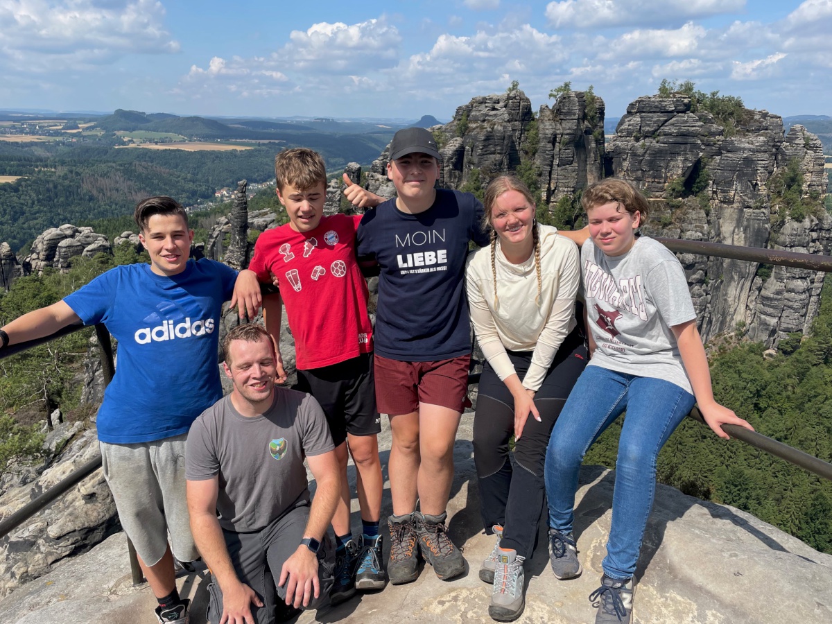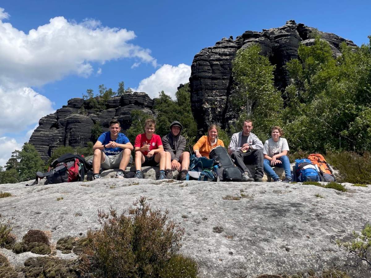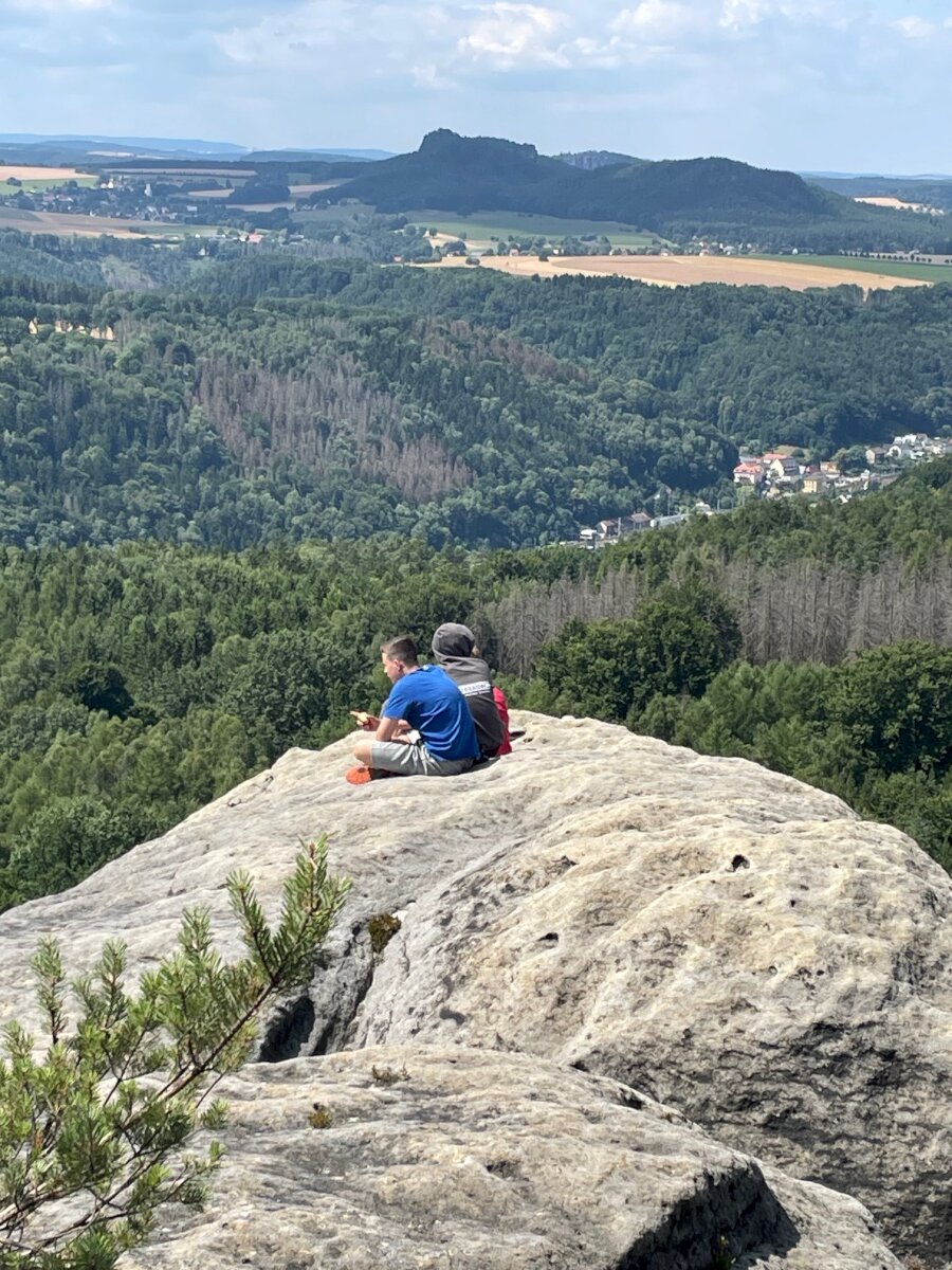 Am Samstag liefen wir insgesamt 11 km bergauf und -ab. Dabei genossen wir die guten und lustigen Gespräche. Die Route, welche Jakob für uns vorbereitet hatte, verlief über die Schrammsteine, von dort aus wir eine wunderschöne Aussicht auf die Elbe und das Naturschutzgebiet hatten. Wir liefen zum Frühstücksplatz, wo wir Mittagspause machten, wobei man nicht unbedingt nur von laufen reden konnte. Es wurde auch viel geklettert. In dem Zuge waren die Teenager Gentlemen und halfen uns mit den Rucksäcken. Dabei stellten sie fest, wer den schwersten Rucksack mit sich herumtrug. Damit war die Diskussion dann auch beendet. 😉