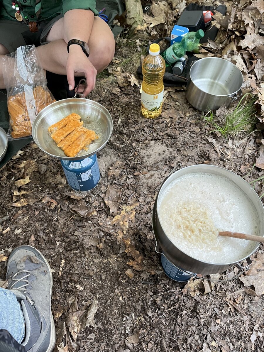 Am nächsten Tag wurden wir zeitig von den Vögeln und dem hellen Tag geweckt. Während des Weges, der 10 km lang war, gab es für unsere Jungpfadfinder kleine Challenges, die sie in Gruppen lösen mussten. In kleinen Verschnaufpausen wurden Spiele gespielt und kleine Wettbewerbe durchgeführt. Beispielsweise „Wanderschuh-Weitwurf“, wobei Sarahs Schuh dran glauben musste. Die Tages-Challenge lautete: „Bastelt aus Material der Natur eine Tasche oder eine Trage, die ein Pfadfinder-Liederbuch tragen kann.“ Dabei waren die Kinder sehr kreativ. Apropos Liederbuch, auf dem Weg haben wir natürlich viel gesungen und singen erleichtert bekanntlicherweise das Wandern. 😉