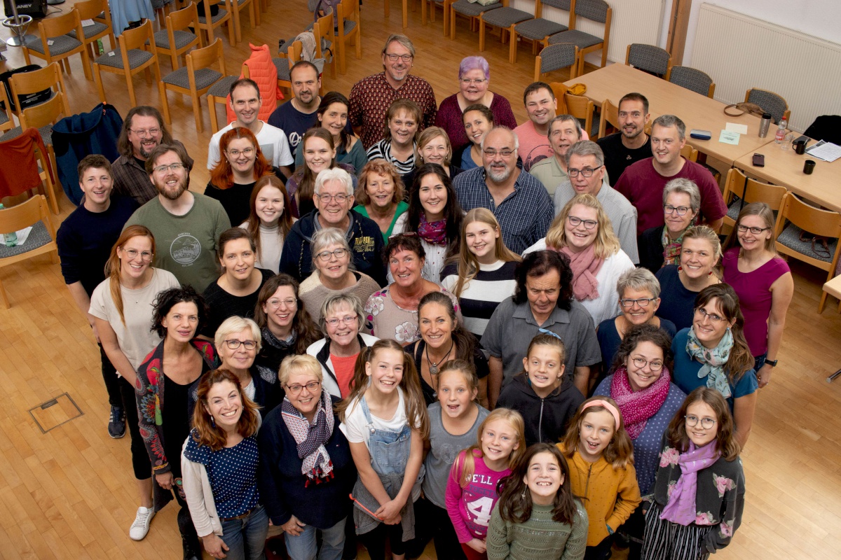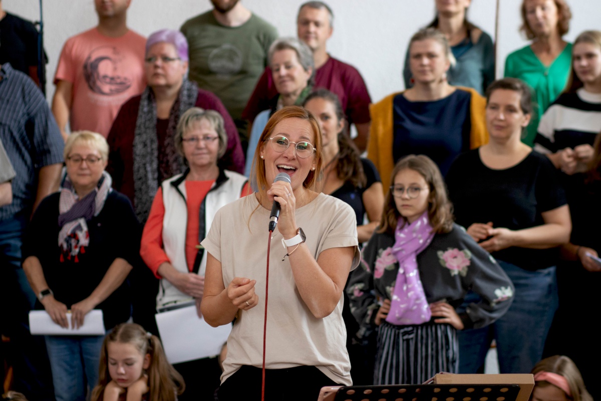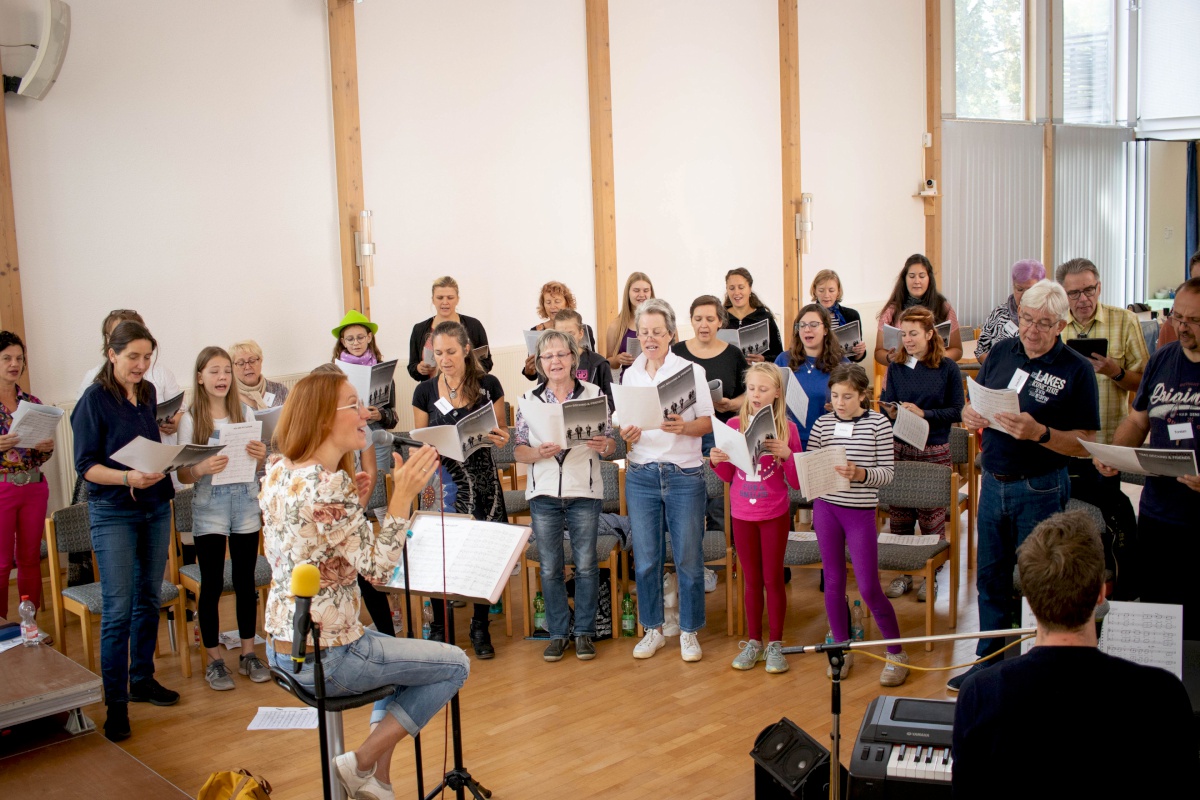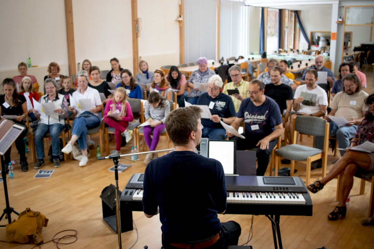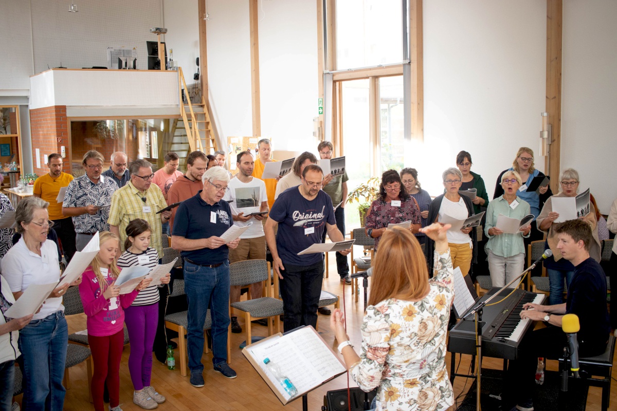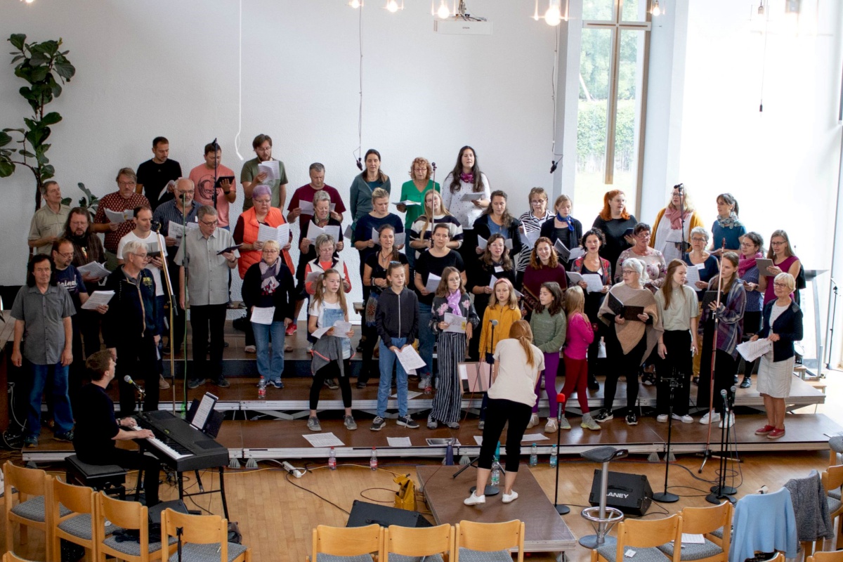 Keep going = weitermachen – das war nicht nur der Titel eines Gospelsongs, sondern entwickelte sich auch zum Motto des Gospelworkshops. Kaum war ein Lied fertig geübt, ging es ans nächste. Von Freitagabend bis Sonntagmittag studierten 50 Teilnehmer/innen unter der Leitung von Anni Barth und Timo Böcking neue Gospelsongs aus der Feder von Timo Böcking ein. Sechs englische und drei deutsche Songs waren es zum Schluss – ein Rekord für den Workshop-Chor und auch für Anni und Timo.
