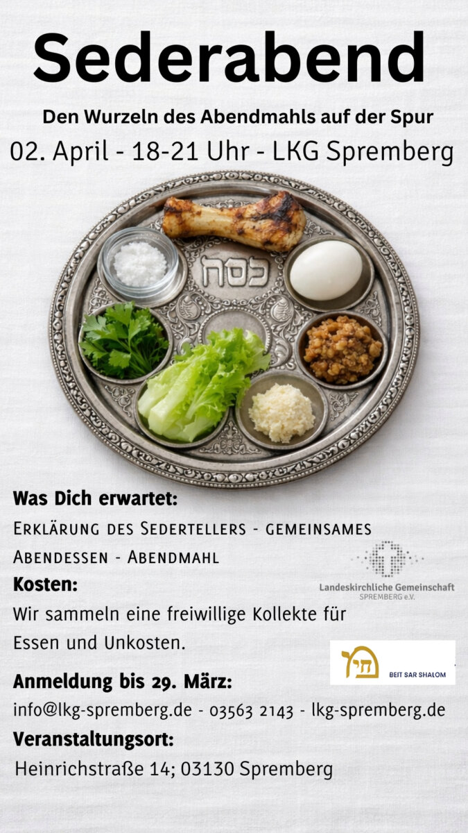 Gemeinsam entdecken wir die biblischen Wurzeln des Abendmahls im jüdischen Pessachfest. In einer angeleiteten Sederfeier lernen wir die Bedeutung der einzelnen Elemente des Sedertellers kennen, erleben ein gemeinsames Abendessen und feiern zum Abschluss das Abendmahl.